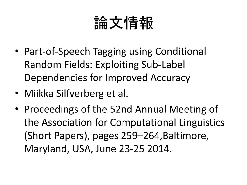 論文情報 • Part-of-Speech Tagging using Conditional Random Fields: Exploiting Sub-Label