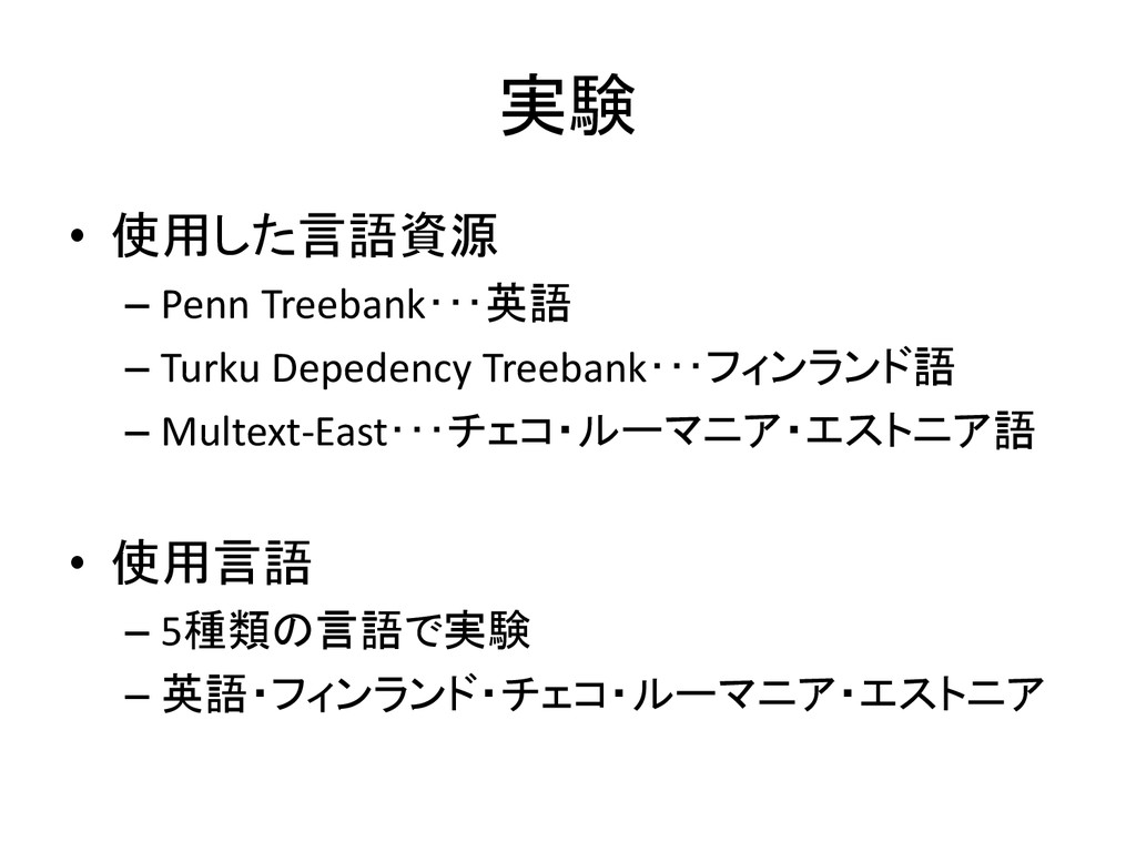 – Multext-East・・・チェコ・ルーマニア・エストニア語 • 使用言語 – 5種類の言語で実験 – 英語・フィンランド・チェコ・ルーマニア・エストニア