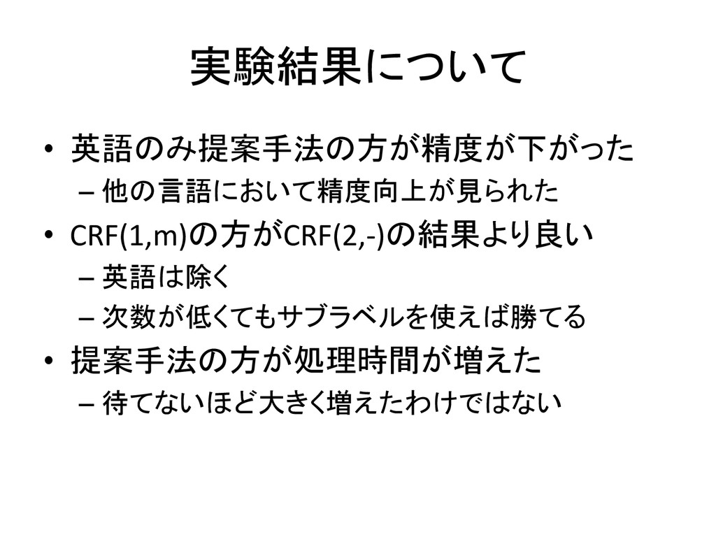 実験結果について • 英語のみ提案手法の方が精度が下がった – 他の言語において精度向上が見られた • CRF(1,m)の方がCRF(2,-)の結果より良い – 英語は除く –