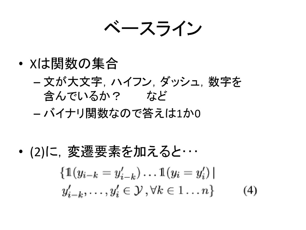 ベースライン • Xは関数の集合 – 文が大文字,ハイフン,ダッシュ,数字を 含んでいるか? など – バイナリ関数なので答えは1か0 •