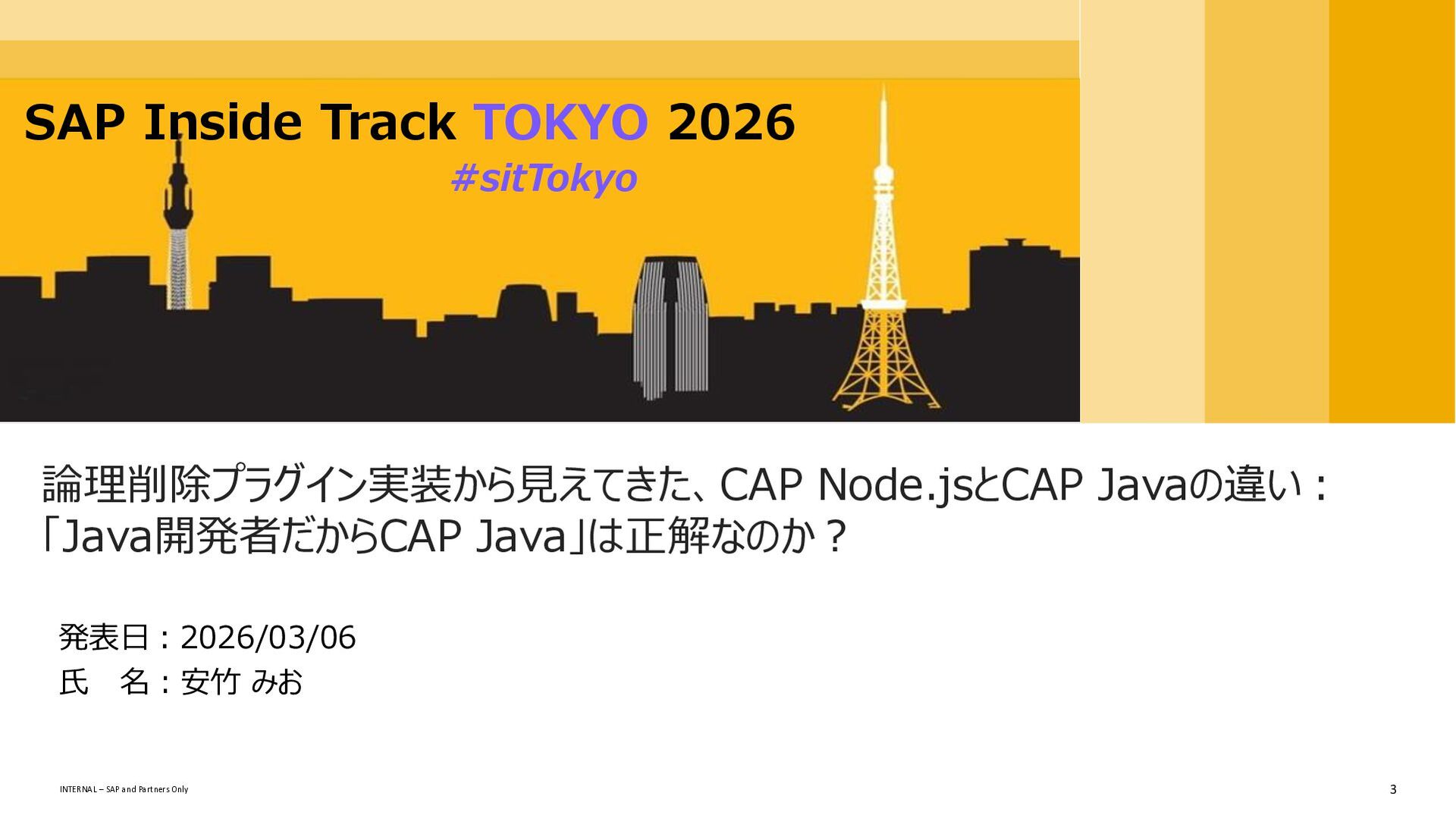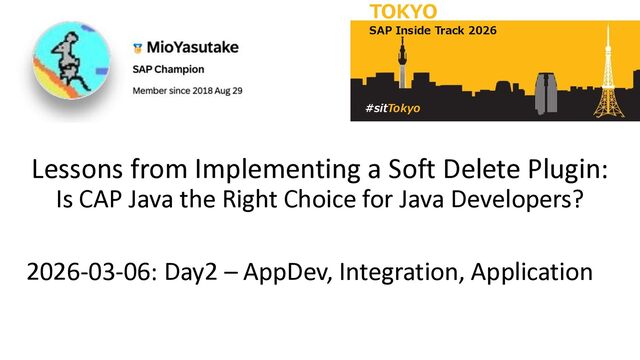 みお 論理削除プラグイン実装から見えてきた、CAP Node.jsとCAP Javaの違い: 「Java開発者だからCAP Java」は正解なのか? SAP Inside Track TOKYO 2026 #sitTokyo