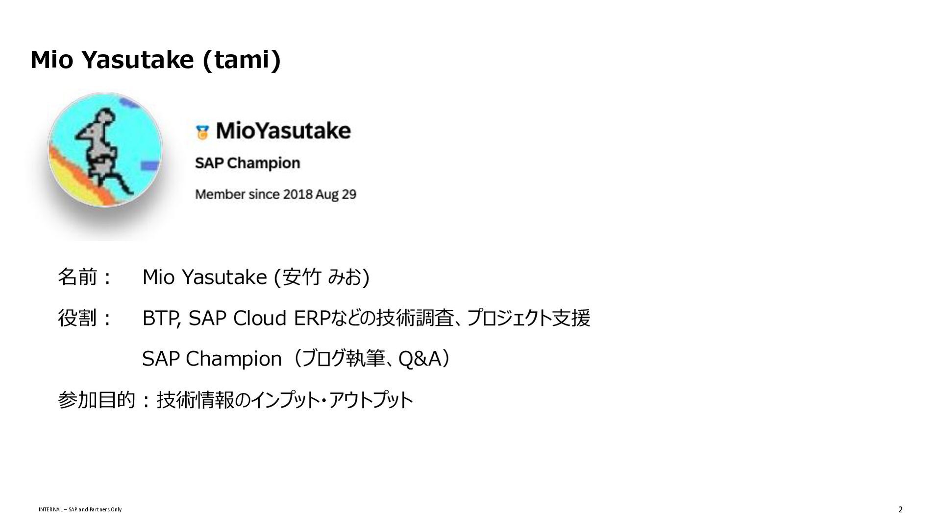 (安竹 みお) 役割: BTP , SAP Cloud ERPなどの技術調査、プロジェクト支援 SAP Champion(ブログ執筆、Q&A) 参加目的:技術情報のインプット・アウトプット Mio Yasutake (tami)
