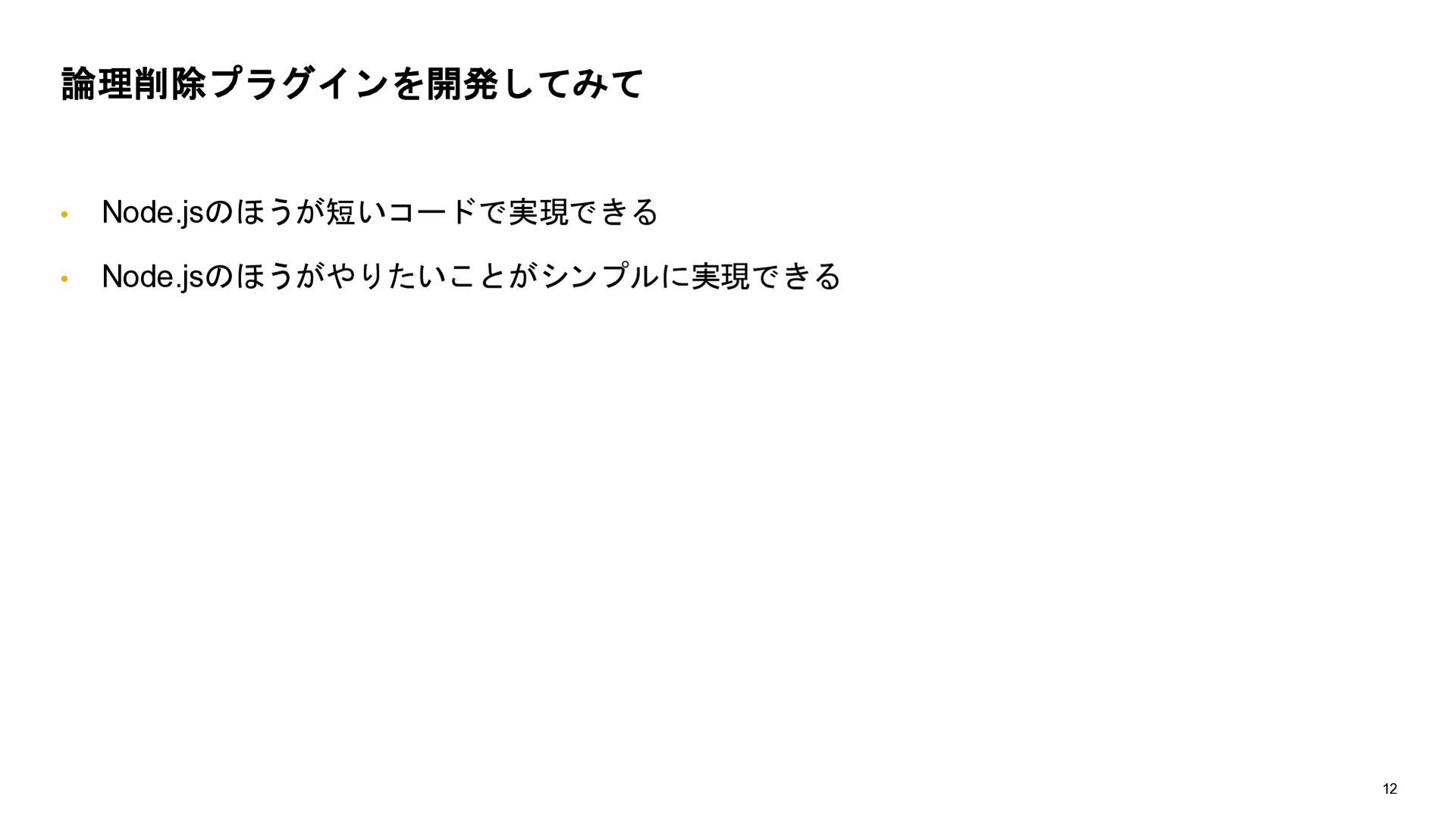 12 • Node.jsのほうが短いコードで実現できる • Node.jsのほうがやりたいことがシンプルに実現できる 論理削除プラグインを開発してみて