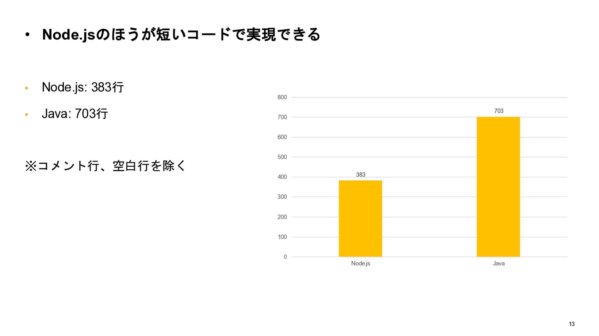 13 • Node.jsのほうが短いコードで実現できる • Node.js: 383行 • Java: 703行 ※コメント行、空白行を除く