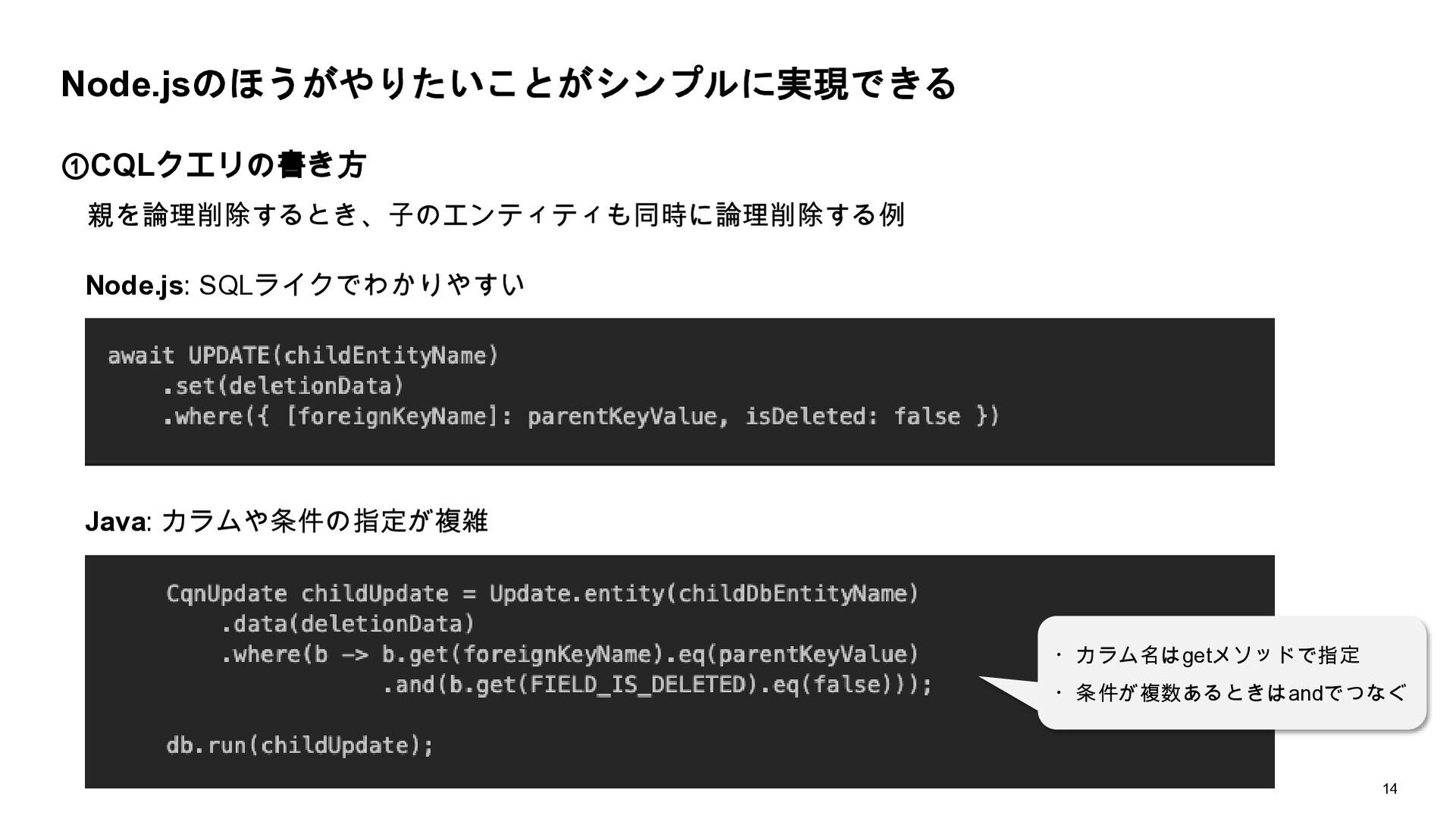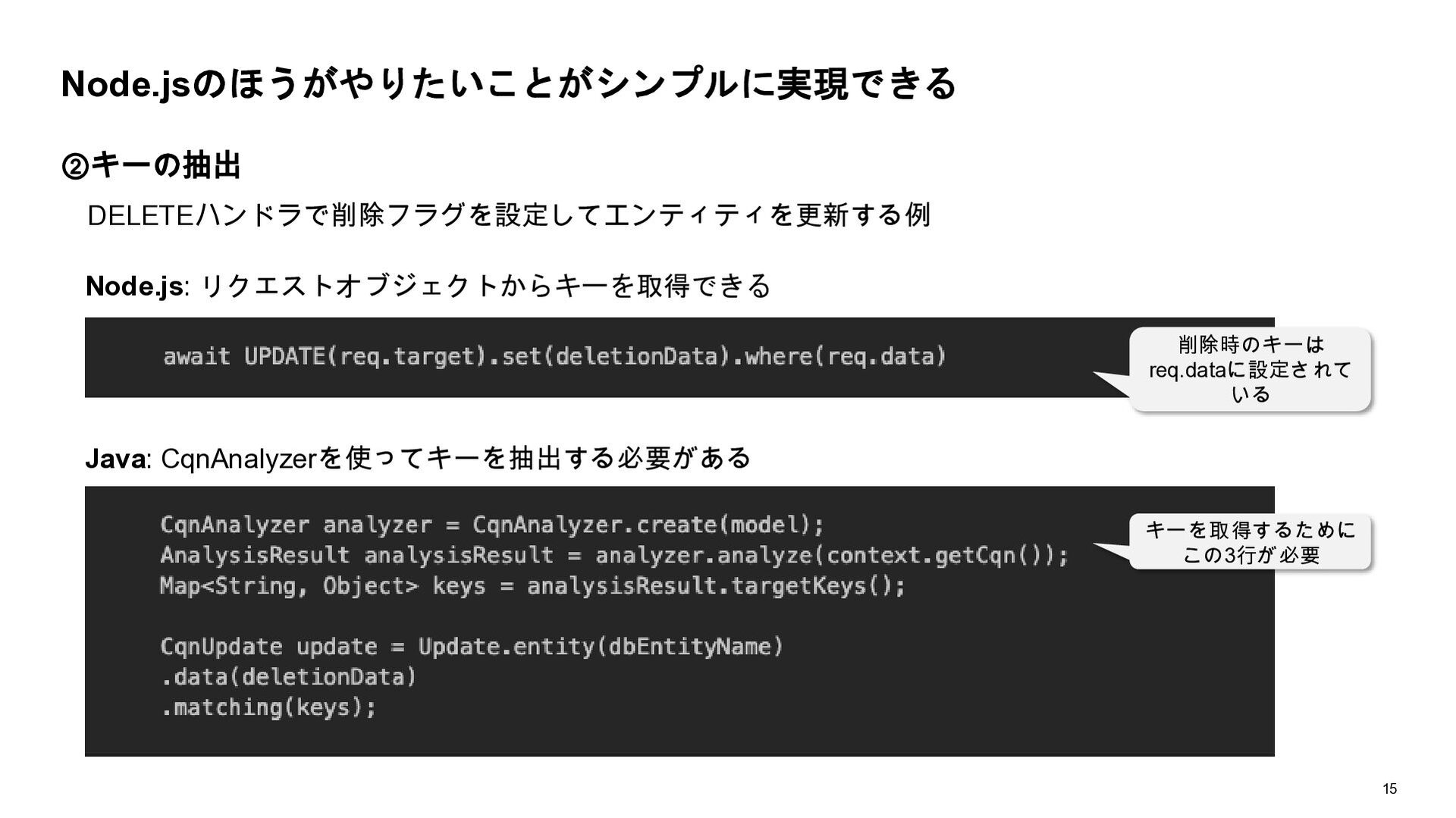 14 Node.jsのほうがやりたいことがシンプルに実現できる ①CQLクエリの書き方 親を論理削除するとき、子のエンティティも同時に論理削除する例 Node.js: SQLライクでわかりやすい Java: カラムや条件の指定が複雑 ・カラム名はgetメソッドで指定 ・条件が複数あるときはandでつなぐ