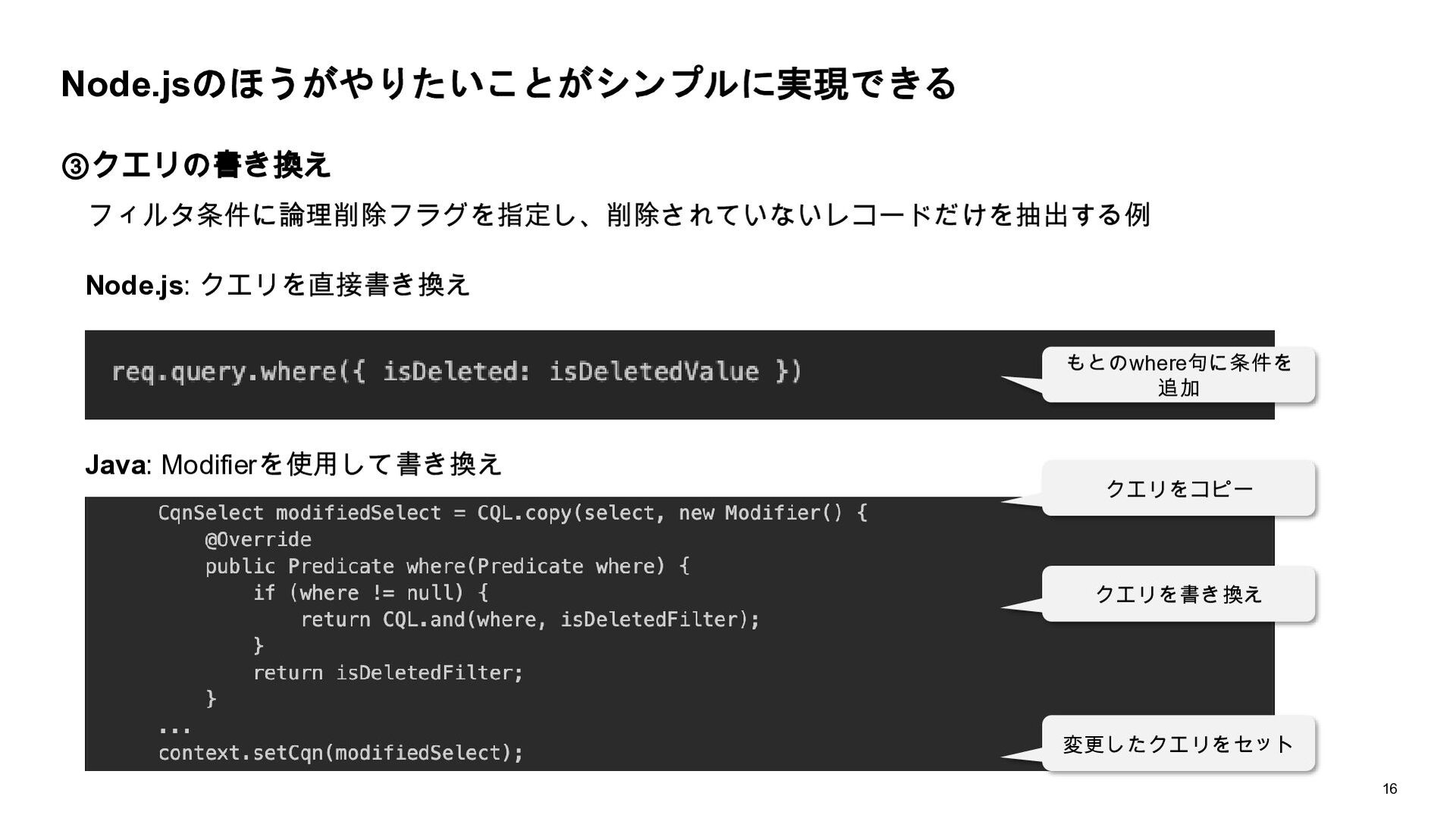 16 Node.jsのほうがやりたいことがシンプルに実現できる Node.js: クエリを直接書き換え ③クエリの書き換え フィルタ条件に論理削除フラグを指定し、削除されていないレコードだけを抽出する例 もとのwhere句に条件を 追加 Java: Modifierを使用して書き換え