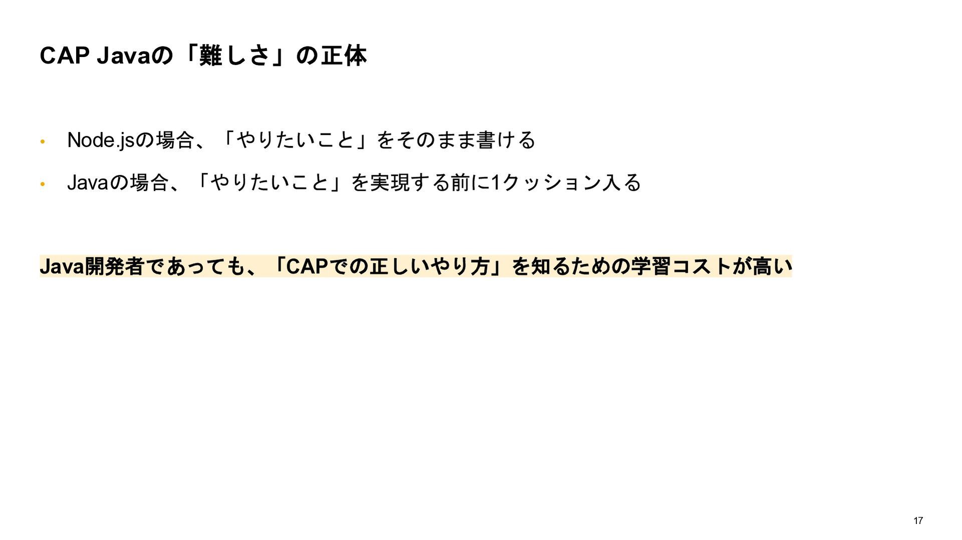 17 CAP Javaの「難しさ」の正体 • Node.jsの場合、「やりたいこと」をそのまま書ける • Javaの場合、「やりたいこと」を実現する前に1クッション入る Java開発者であっても、「CAPでの正しいやり方」を知るための学習コストが高い