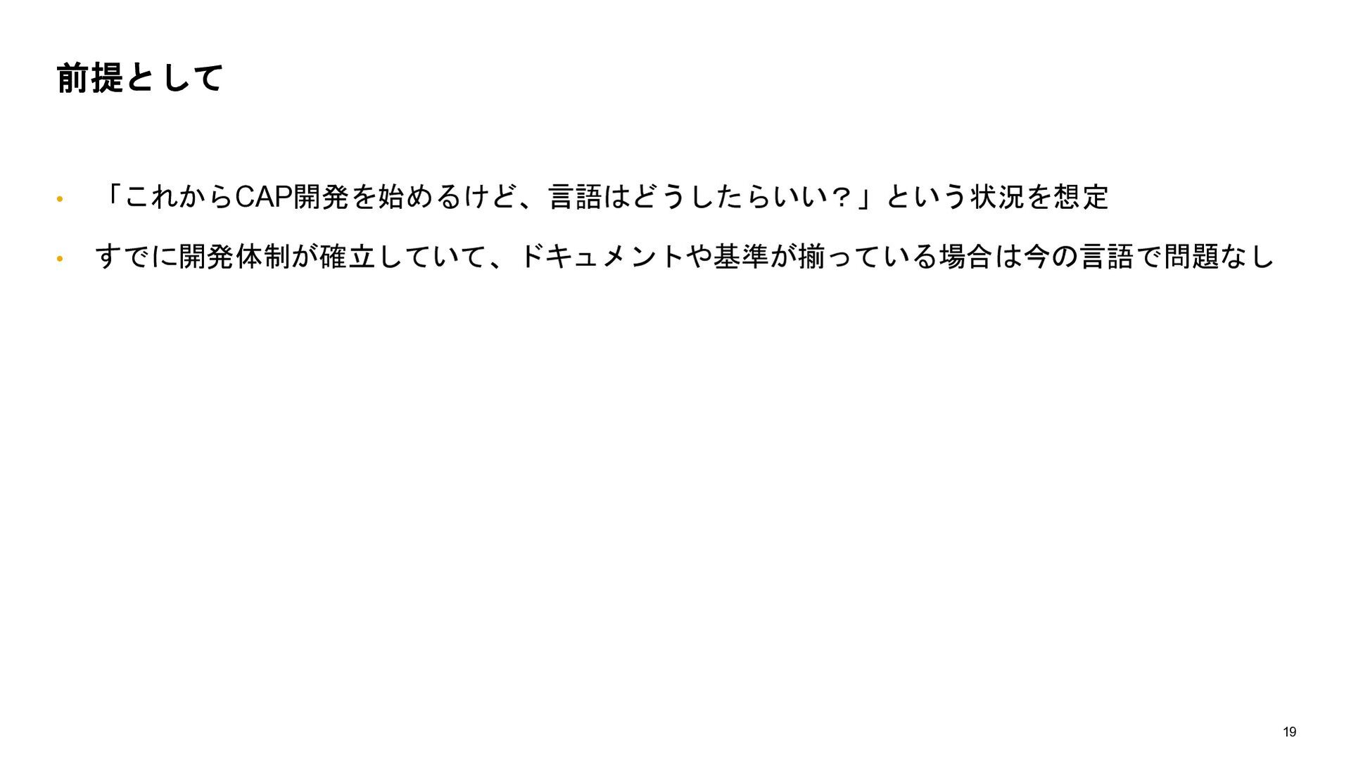 19 • 「これからCAP開発を始めるけど、言語はどうしたらいい?」という状況を想定 • すでに開発体制が確立していて、ドキュメントや基準が揃っている場合は今の言語で問題なし 前提として