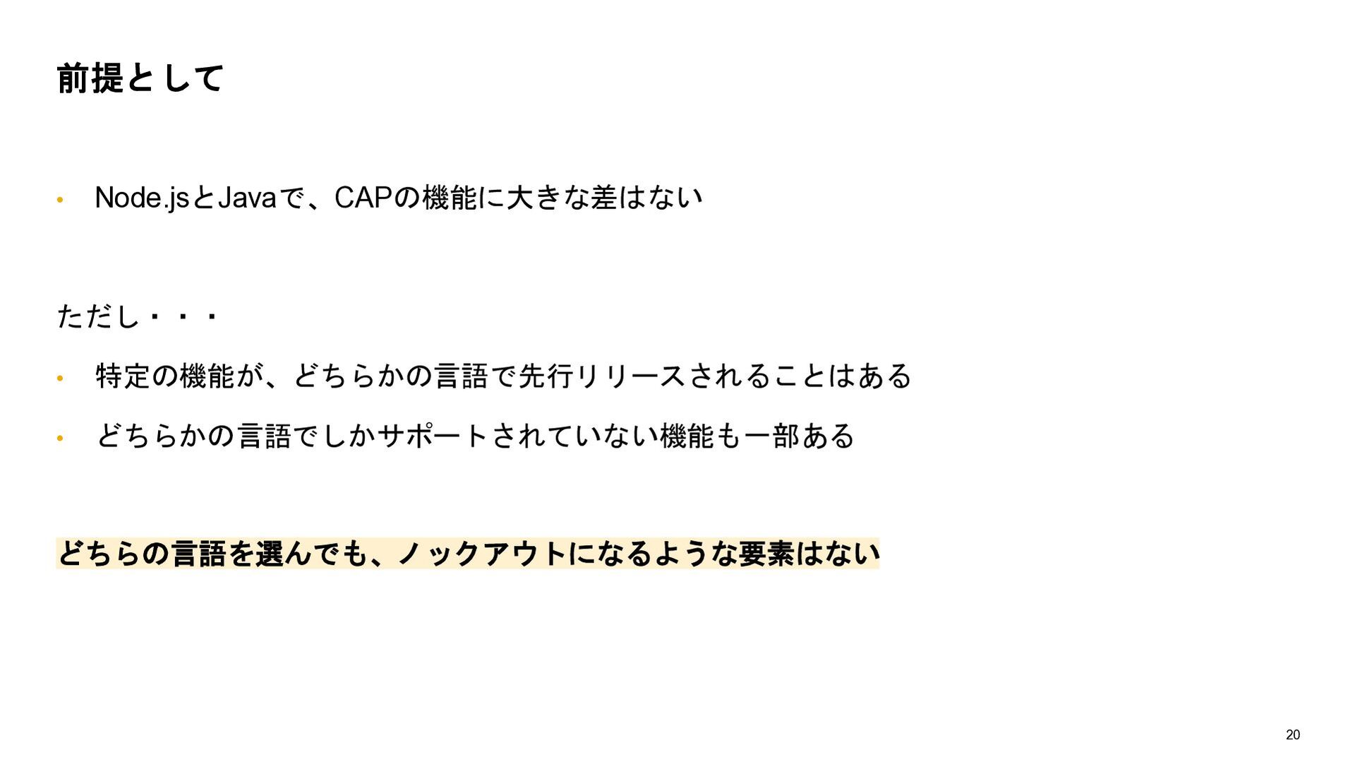 20 • Node.jsとJavaで、CAPの機能に大きな差はない ただし・・・ • 特定の機能が、どちらかの言語で先行リリースされることはある • どちらかの言語でしかサポートされていない機能も一部ある どちらの言語を選んでも、ノックアウトになるような要素はない 前提として