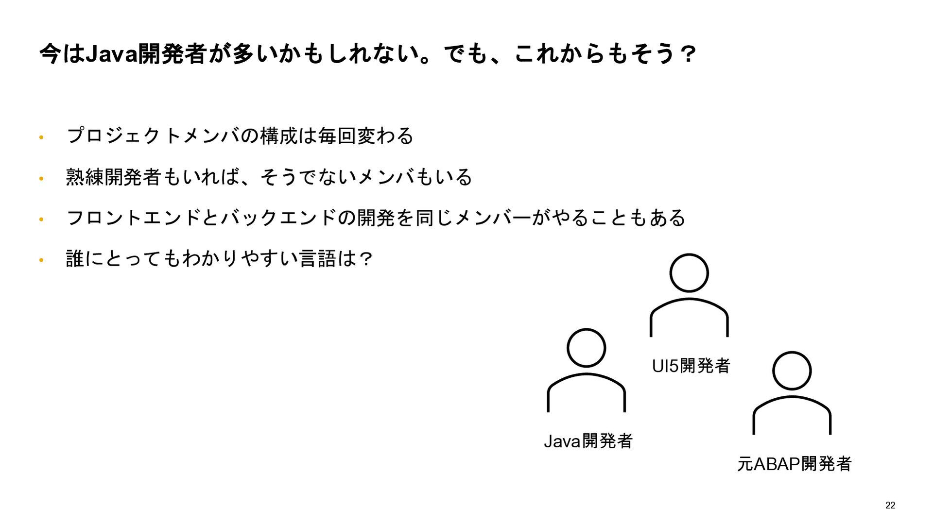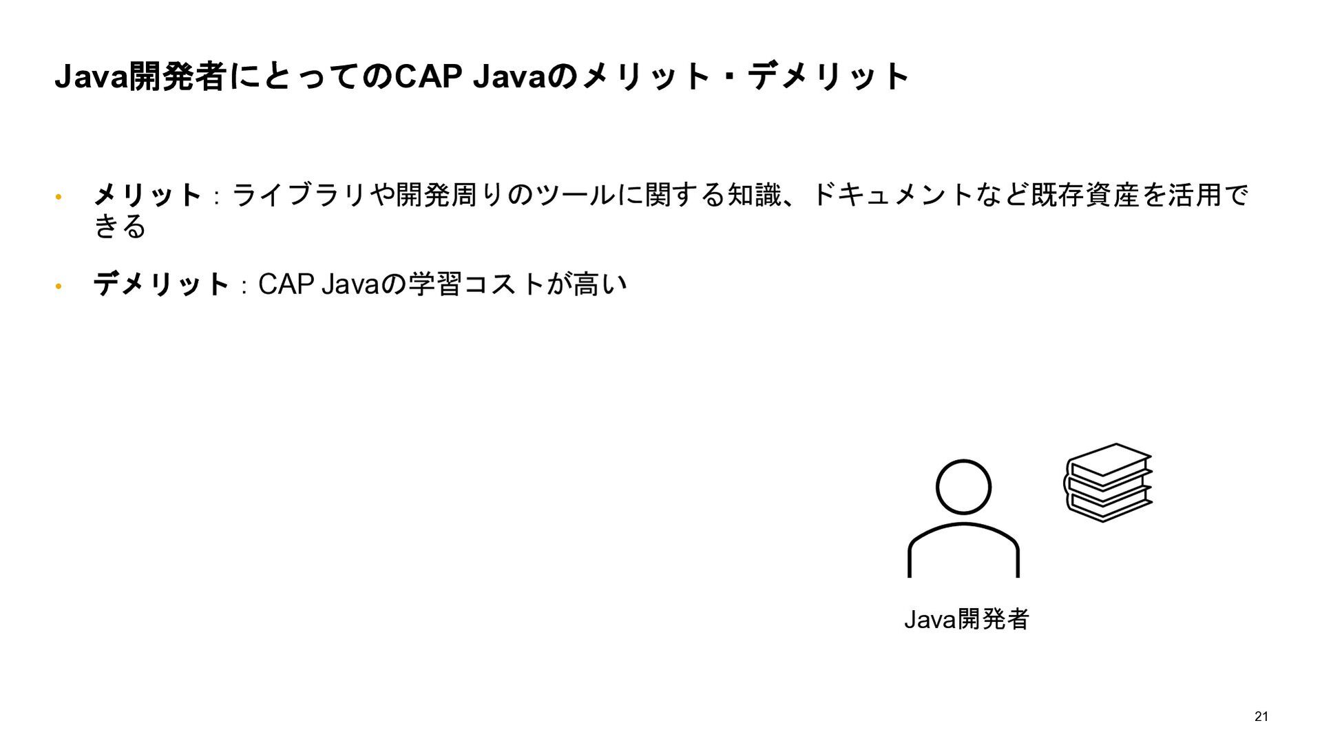 21 • メリット:ライブラリや開発周りのツールに関する知識、ドキュメントなど既存資産を活用で きる • デメリット:CAP Javaの学習コストが高い Java開発者にとってのCAP Javaのメリット・デメリット Java開発者