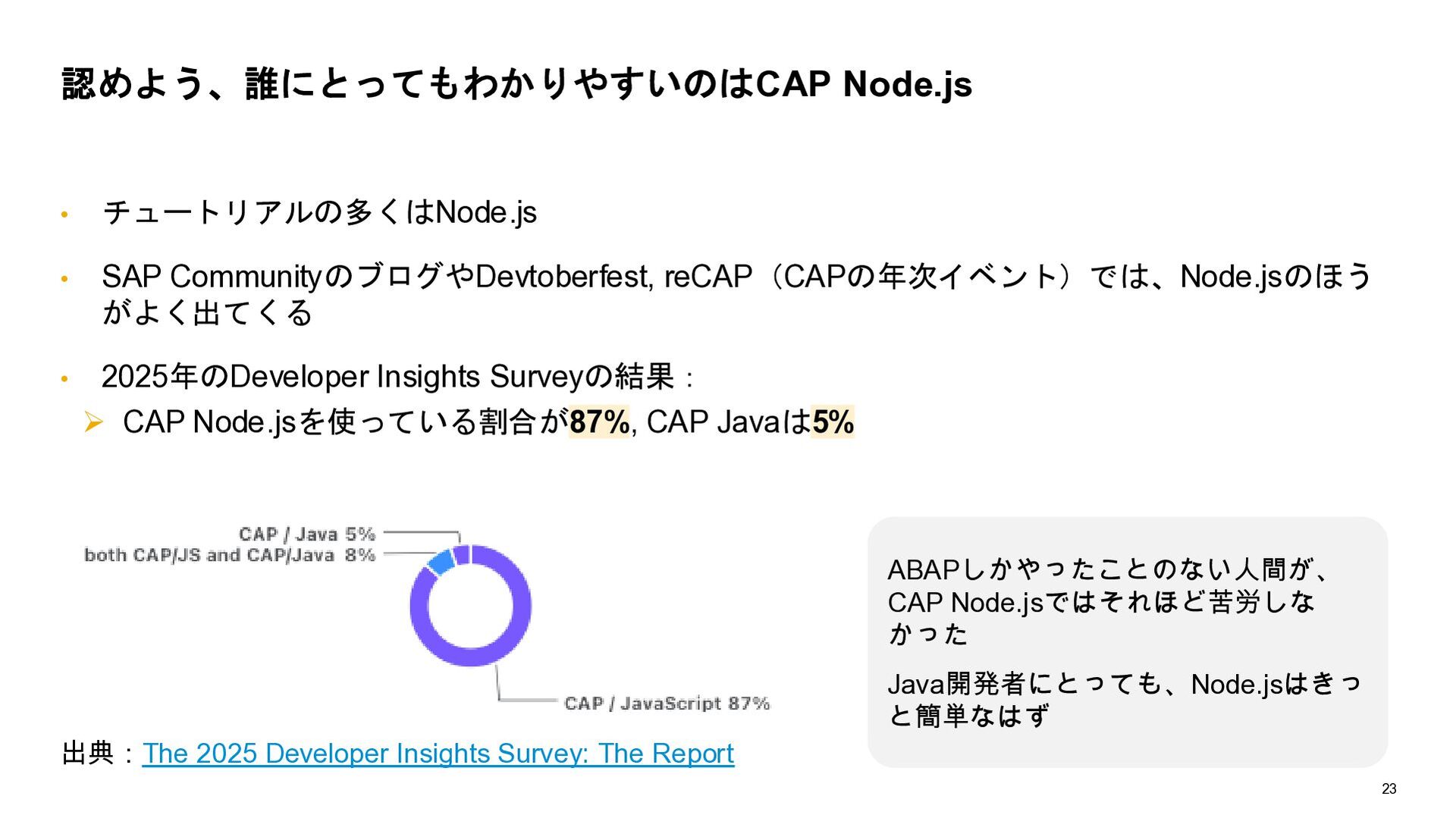 Insights Surveyの結果: ➢ CAP Node.jsを使っている割合が87%, CAP Javaは5% 認めよう、誰にとってもわかりやすいのはCAP Node.js 出典:The 2025 Developer Insights Survey: The Report ABAPしかやったことのない人間が、 CAP Node.jsではそれほど苦労しな かった Java開発者にとっても、Node.jsはきっ と簡単なはず