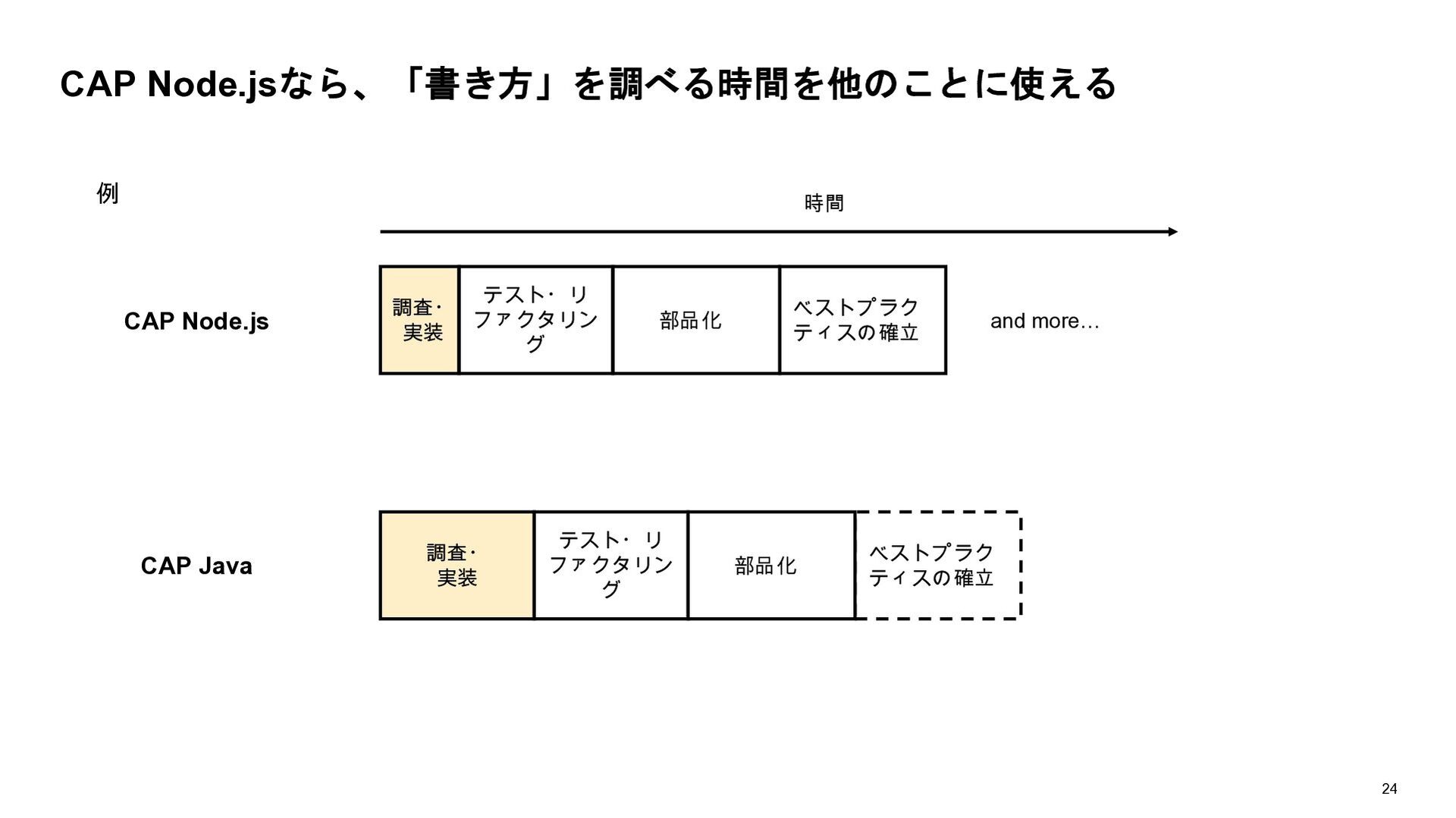 ティスの確立 and more… CAP Node.js 時間 テスト・リ ファクタリン グ 部品化 ベストプラク ティスの確立 CAP Java 調査・ 実装 例