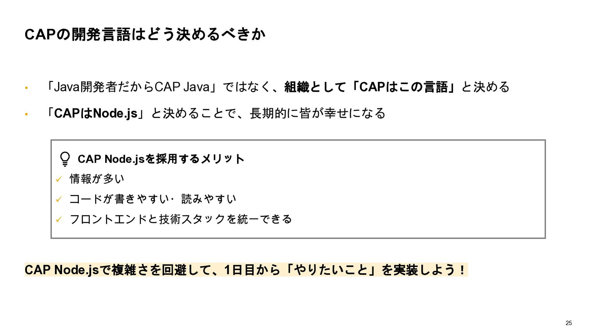 23 • チュートリアルの多くはNode.js • SAP CommunityのブログやDevtoberfest, reCAP(CAPの年次イベント)では、Node.jsのほう がよく出てくる • 2025年のDeveloper