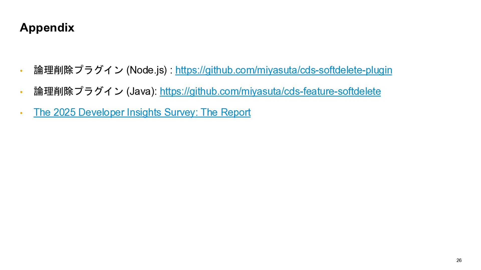 26 • 論理削除プラグイン (Node.js) : https://github.com/miyasuta/cds-softdelete-plugin • 論理削除プラグイン (Java): https://github.com/miyasuta/cds-feature-softdelete