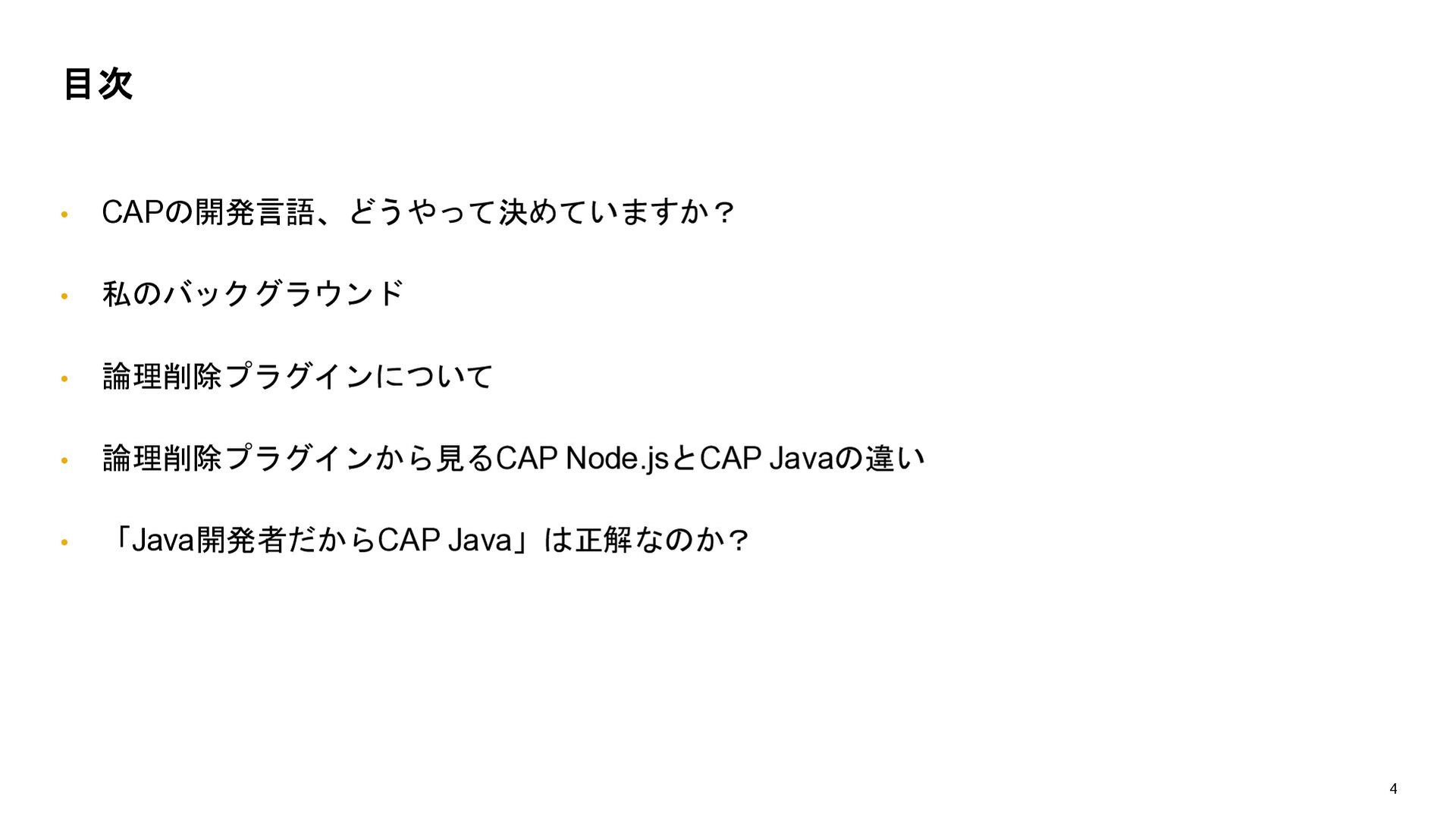 4 • CAPの開発言語、どうやって決めていますか? • 私のバックグラウンド • 論理削除プラグインについて • 論理削除プラグインから見るCAP Node.jsとCAP