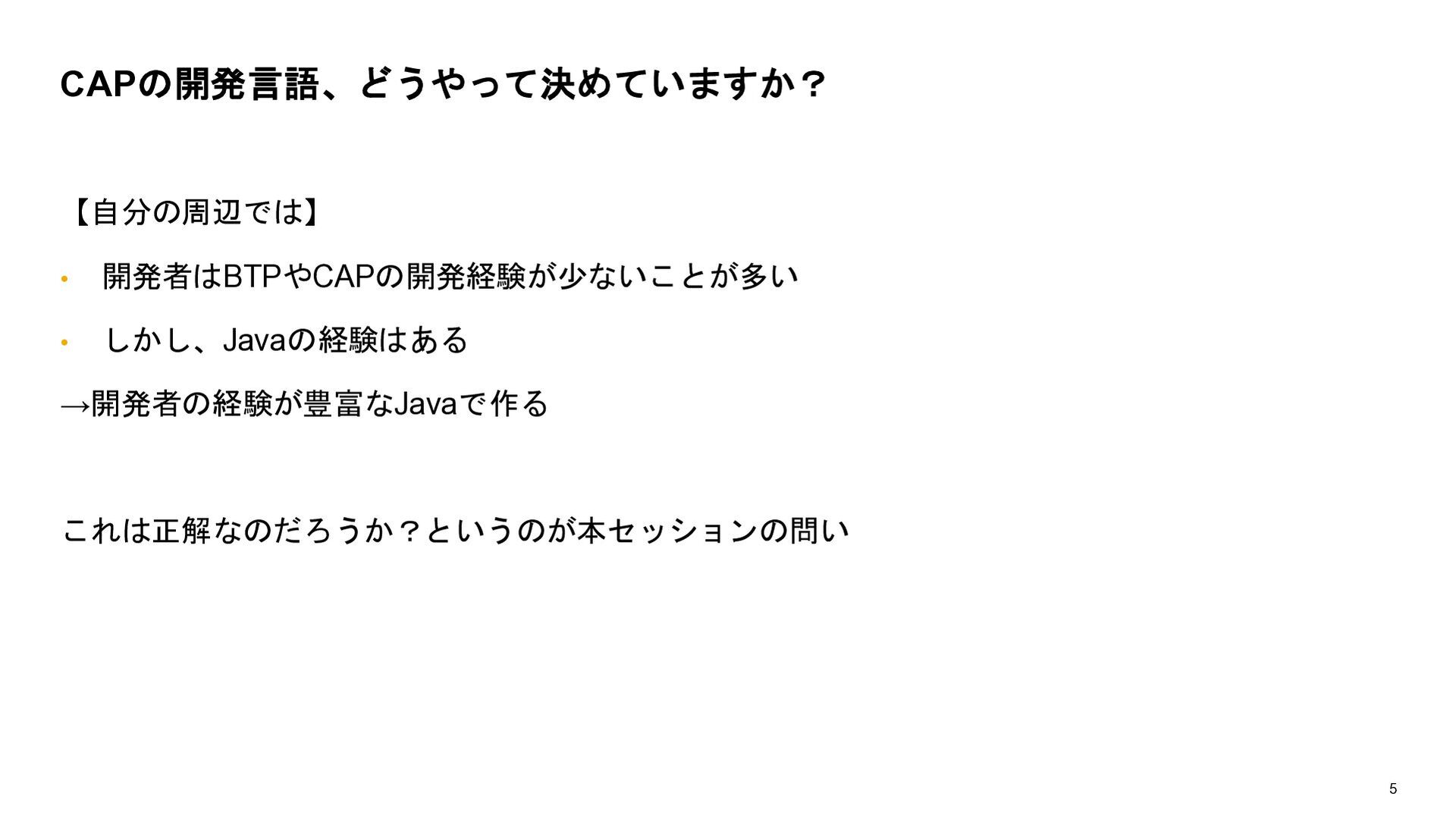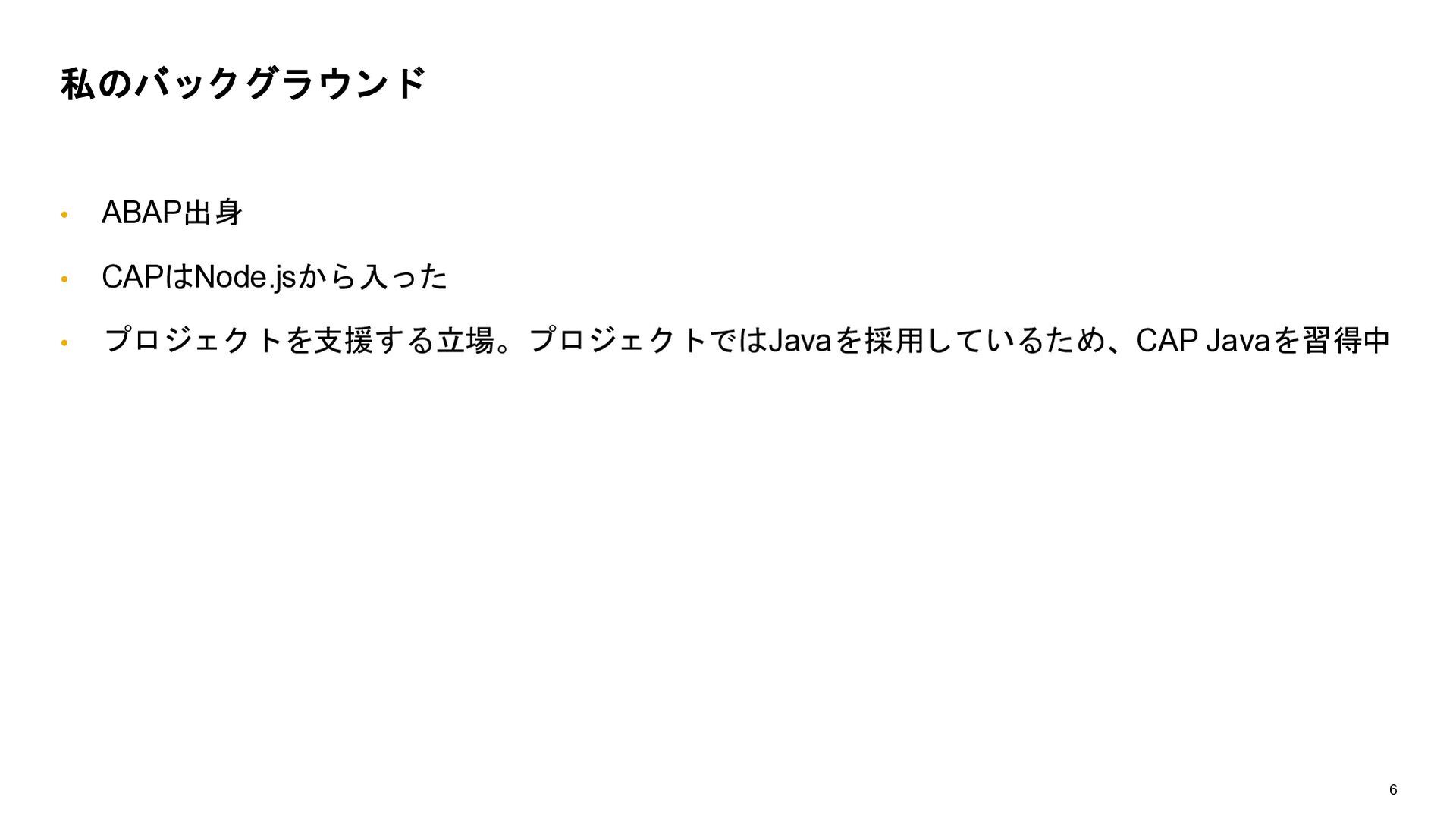 5 【自分の周辺では】 • 開発者はBTPやCAPの開発経験が少ないことが多い • しかし、Javaの経験はある →開発者の経験が豊富なJavaで作る これは正解なのだろうか?というのが本セッションの問い CAPの開発言語、どうやって決めていますか?