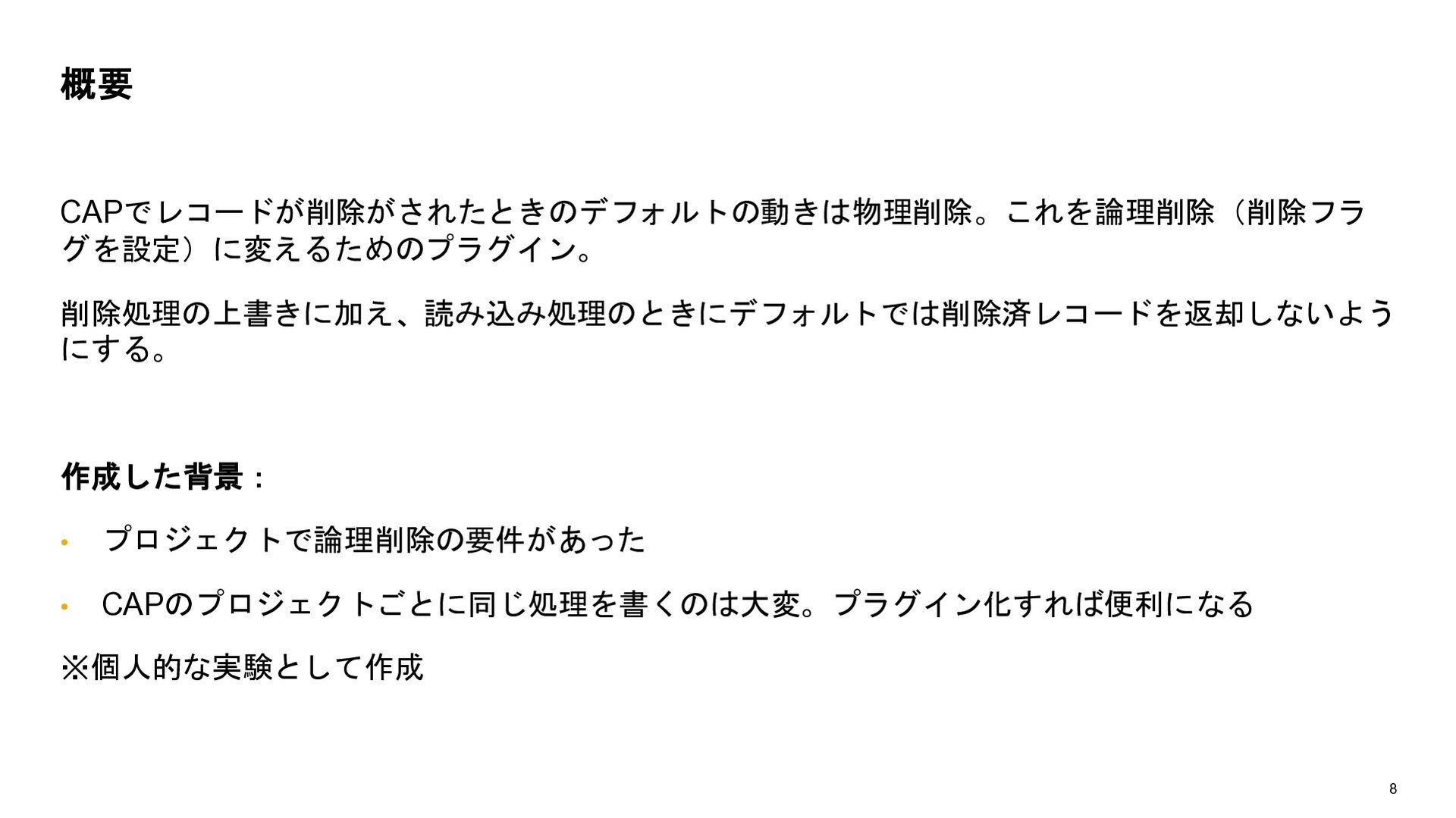8 CAPでレコードが削除がされたときのデフォルトの動きは物理削除。これを論理削除(削除フラ グを設定)に変えるためのプラグイン。 削除処理の上書きに加え、読み込み処理のときにデフォルトでは削除済レコードを返却しないよう にする。 作成した背景: • プロジェクトで論理削除の要件があった • CAPのプロジェクトごとに同じ処理を書くのは大変。プラグイン化すれば便利になる