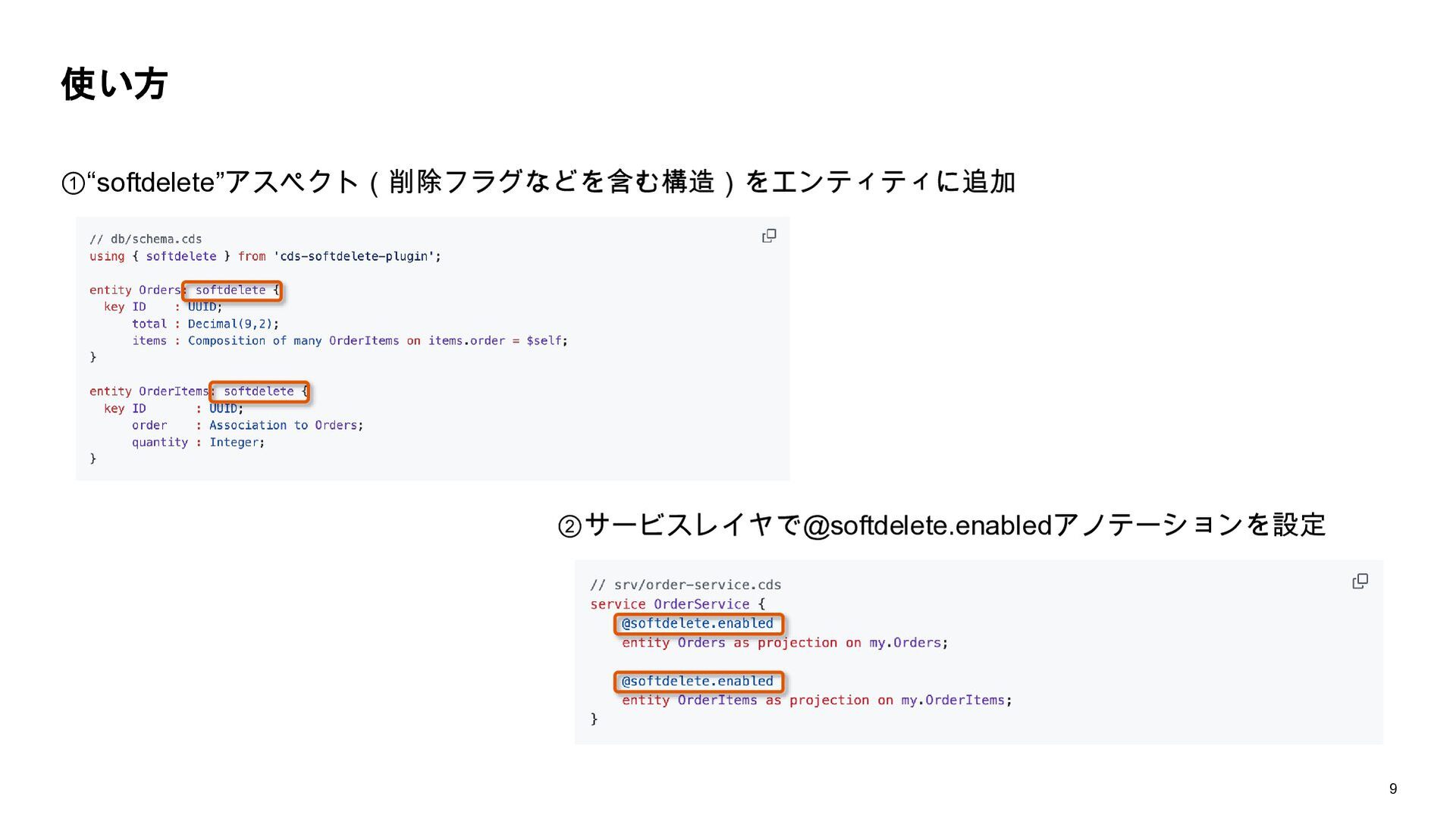 9 使い方 ①“softdelete”アスペクト(削除フラグなどを含む構造)をエンティティに追加 ②サービスレイヤで@softdelete.enabledアノテーションを設定