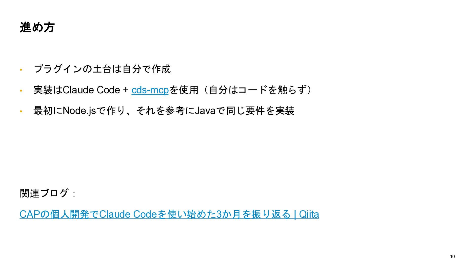 10 • プラグインの土台は自分で作成 • 実装はClaude Code + cds-mcpを使用(自分はコードを触らず) • 最初にNode.jsで作り、それを参考にJavaで同じ要件を実装