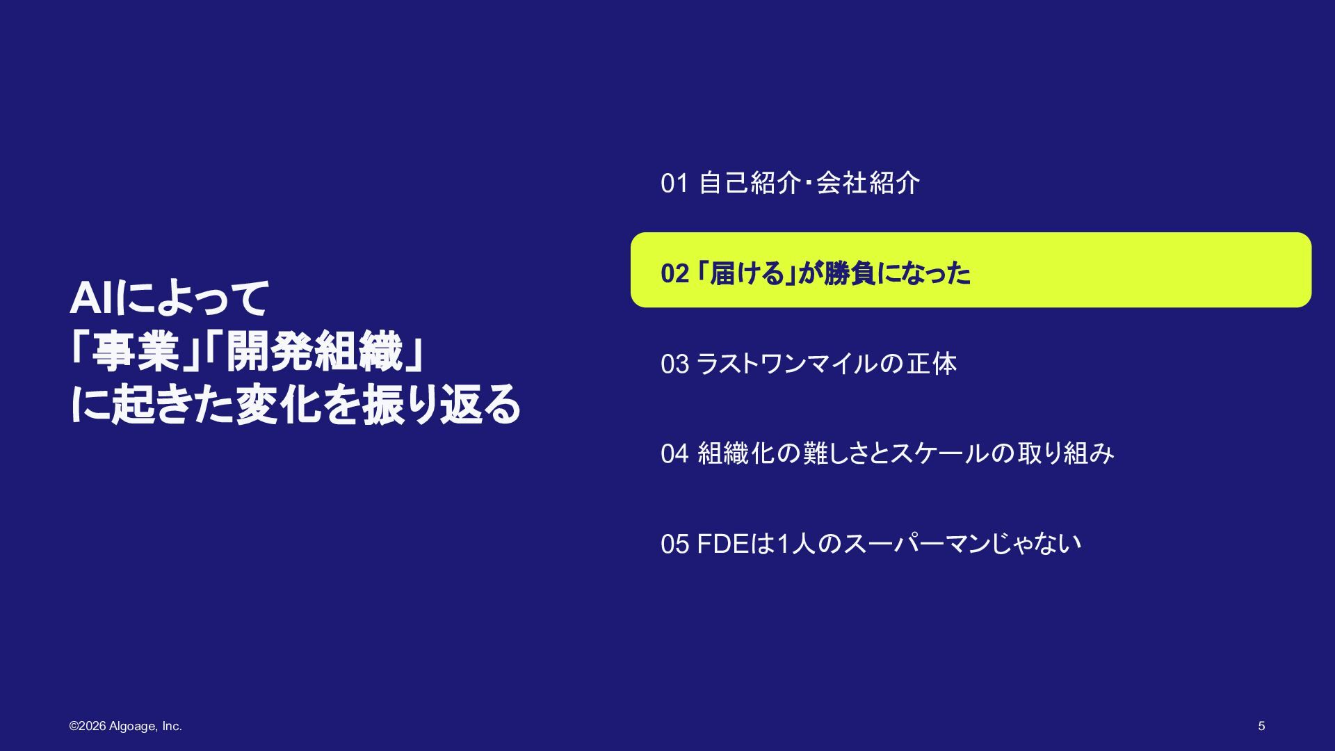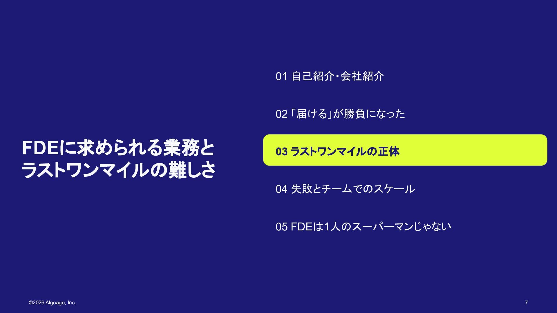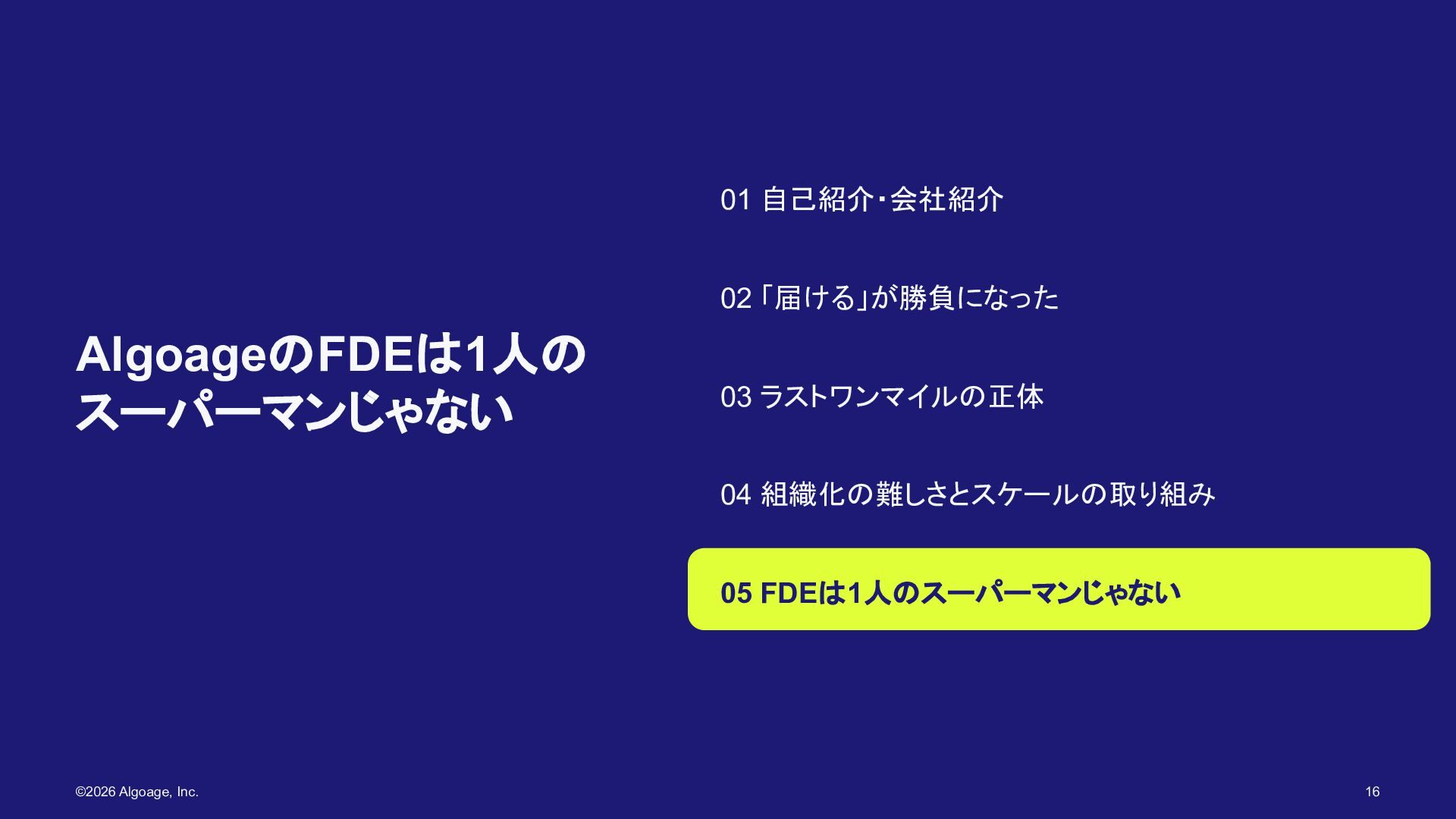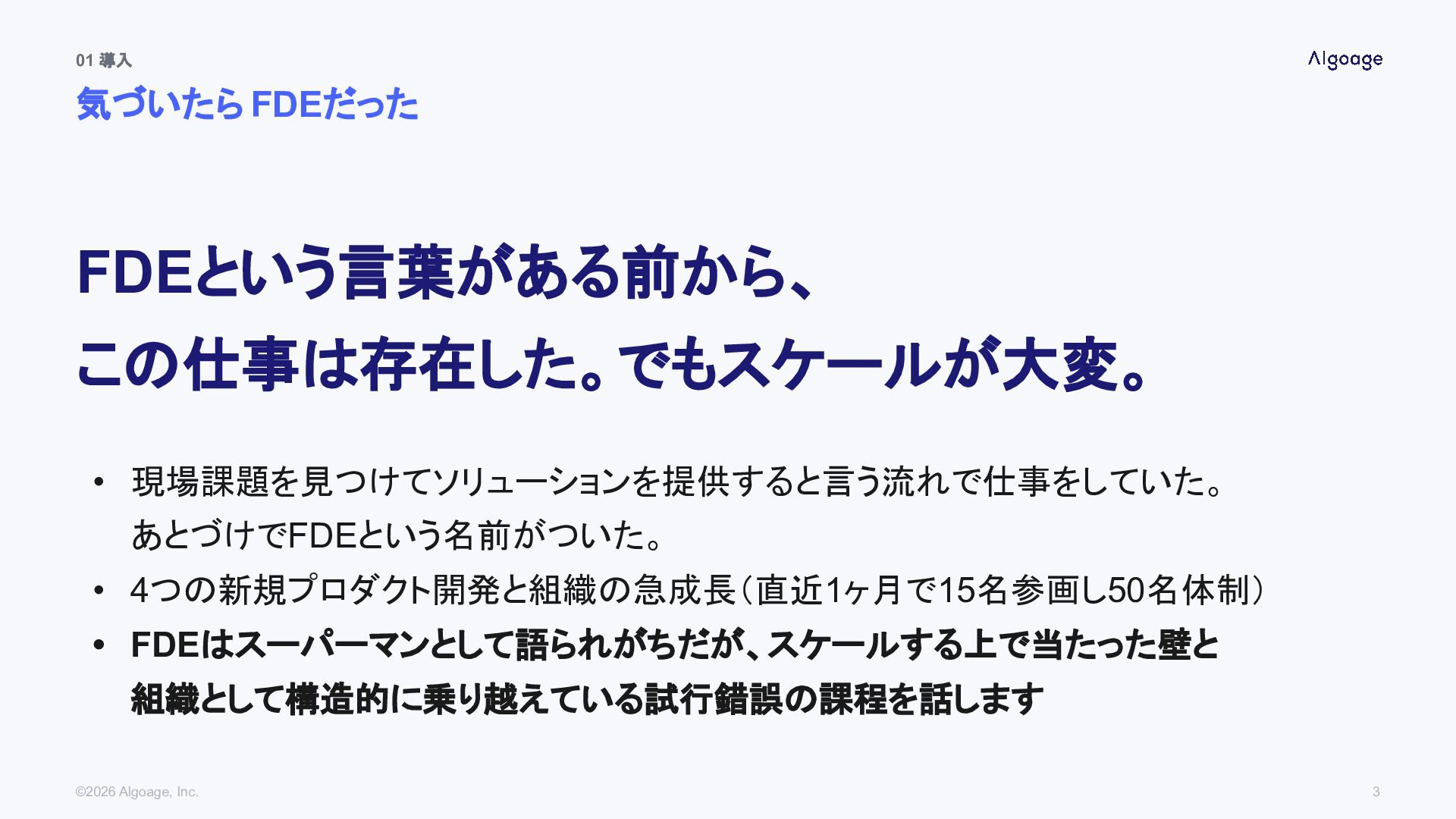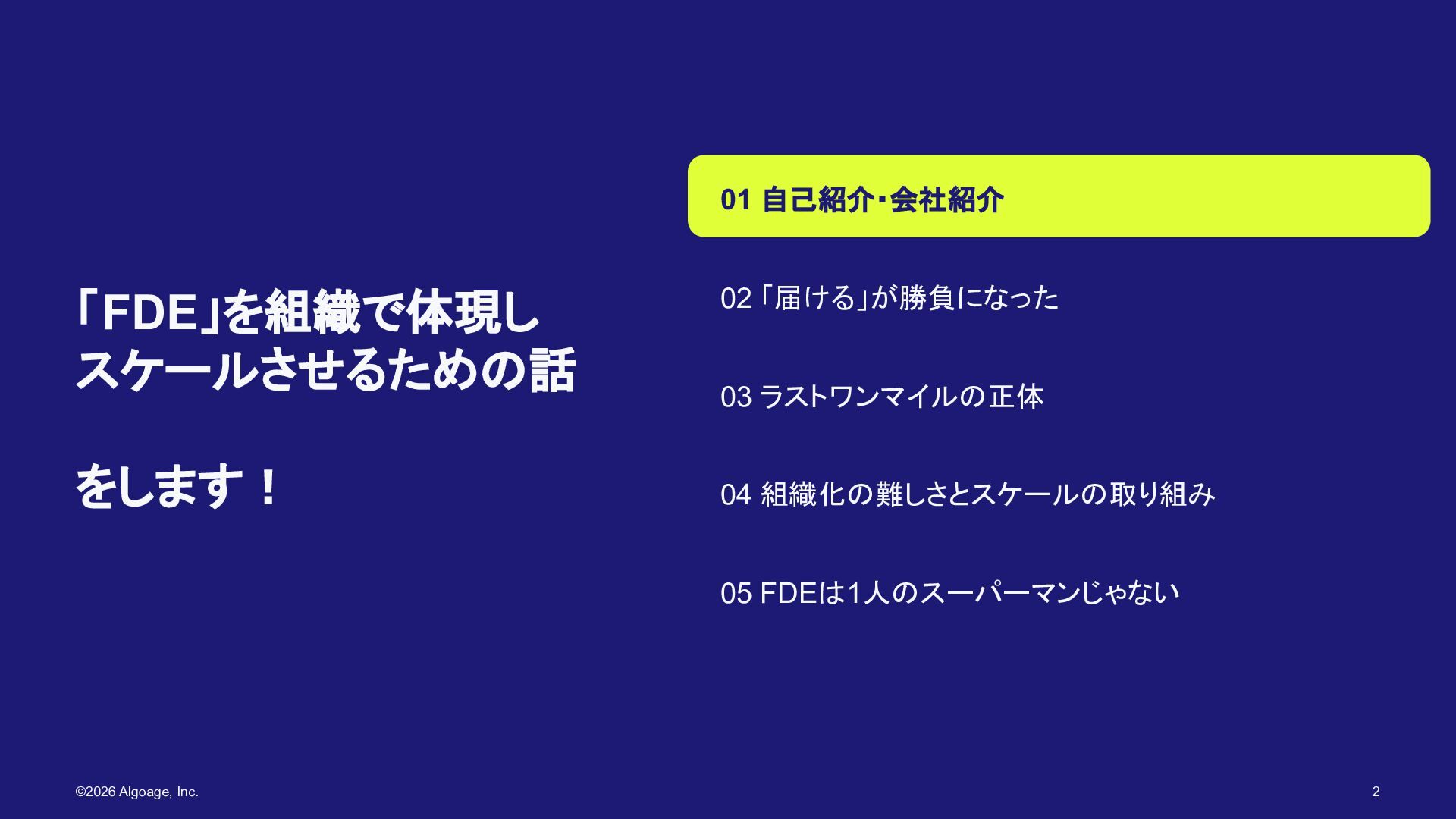 AlgoageのFDEは1人の スーパーマンじゃない 01 自己紹介・会社紹介 02 「届ける」が勝負になった 03 ラストワンマイルの正体 04 組織化の難しさとスケールの取り組み