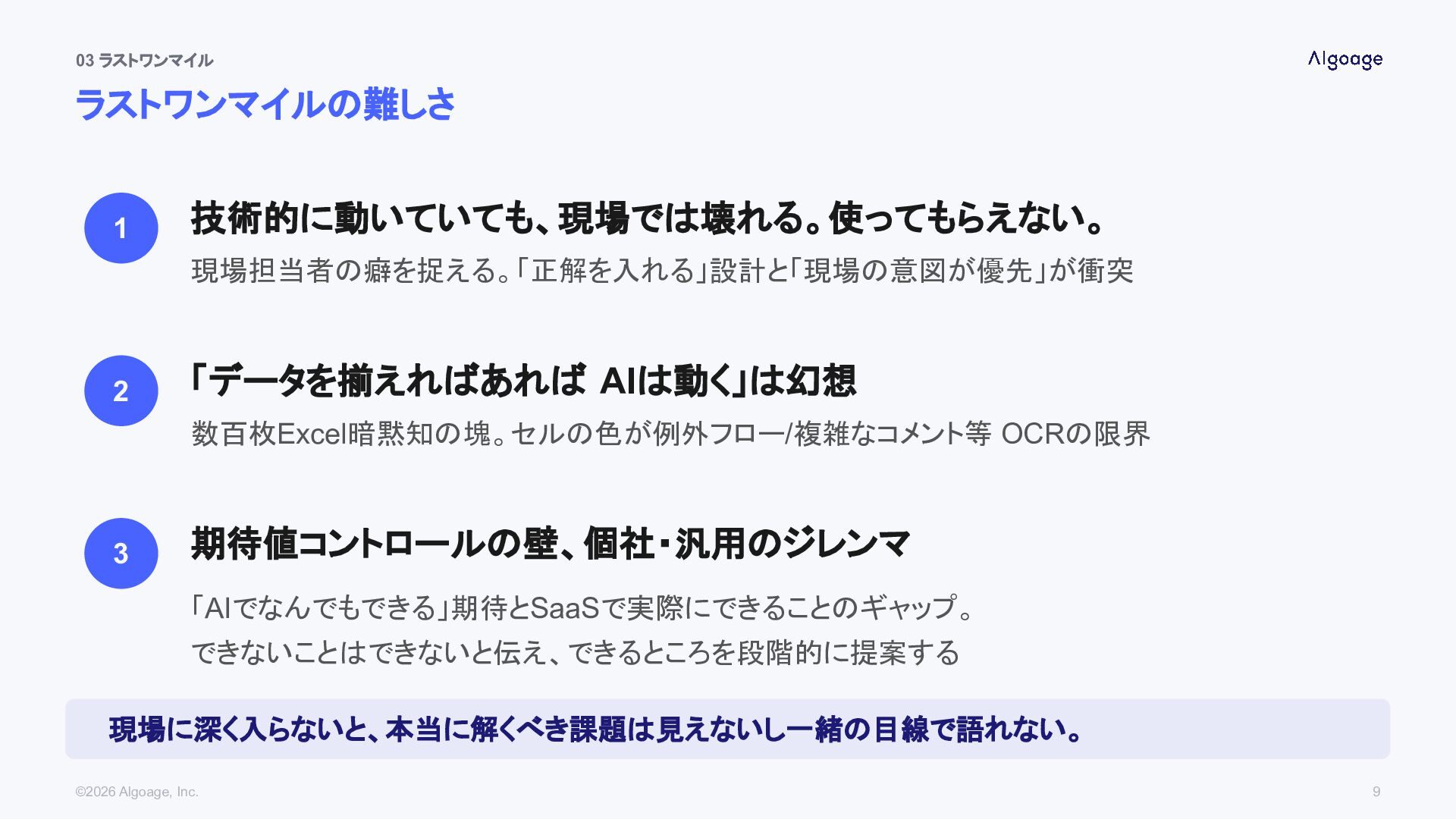 Step 2 課題特定 業務フロー課題特定 期待値を整理する Step 3 ソリューション 提案 AIでできる/できない を提案 ・現場を壊さない ・仲間として 一緒にやる姿勢 Step 4 作って届ける 個社拡張を実装して 顧客に価値を出す Step 5 事業に還元 個社の知見 汎用機能に プロダクトが 賢くなる ©2026 Algoage, Inc. 8 ベースは事業の成長を KGIとして最適化する 現場への敬意を忘れない。「なんか AIの人たちが来た」と思われたら終わり。 「置き換えに来ました」じゃなくて「痛みを取り除きに来ました」。