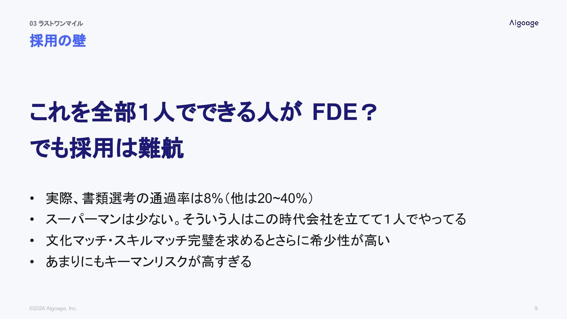 03 ラストワンマイル 採用の壁 ©2026 Algoage, Inc. 9 これを全部1人でできる人が FDE? でも採用は難航