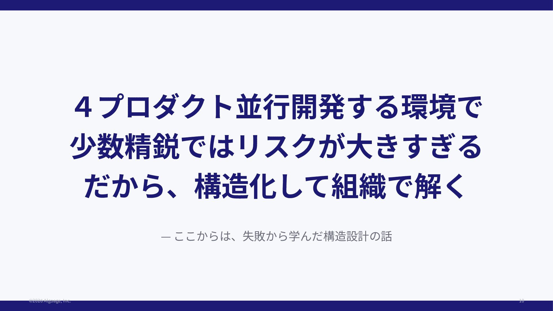 — ここからは、失敗から学んだ構造設計の話 4プロダクト並⾏開発する環境で 少数精鋭ではリスクが⼤きすぎる だから、構造化して組織で解く ©2026 Algoage, Inc. 10