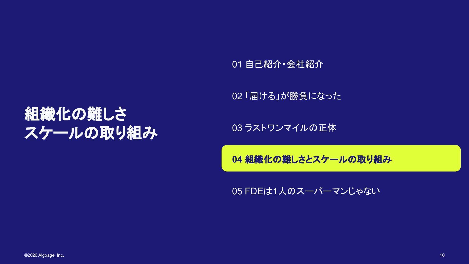 05 FDEは1人のスーパーマンじゃない ©2026 Algoage, Inc. 10