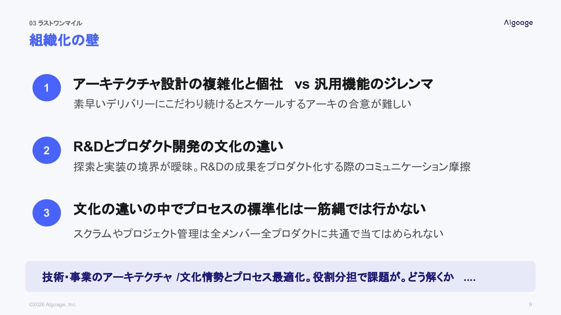 R&Dとプロダクト開発の文化の違い 探索と実装の境界が曖昧。R&Dの成果をプロダクト化する際のコミュニケーション摩擦 3 文化の違いの中でプロセスの標準化は一筋縄では行かない 技術・事業のアーキテクチャ /文化情勢とプロセス最適化。役割分担で課題が。どう解くか .... ©2026 Algoage, Inc. 9