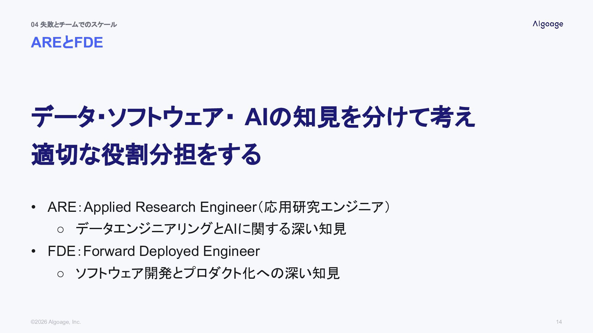 ◦ ソフトウェア開発とプロダクト化への深い知見 04 失敗とチームでのスケール AREとFDE ©2026 Algoage, Inc. 14 データ・ソフトウェア・ AIの知見を分けて考え 適切な役割分担をする