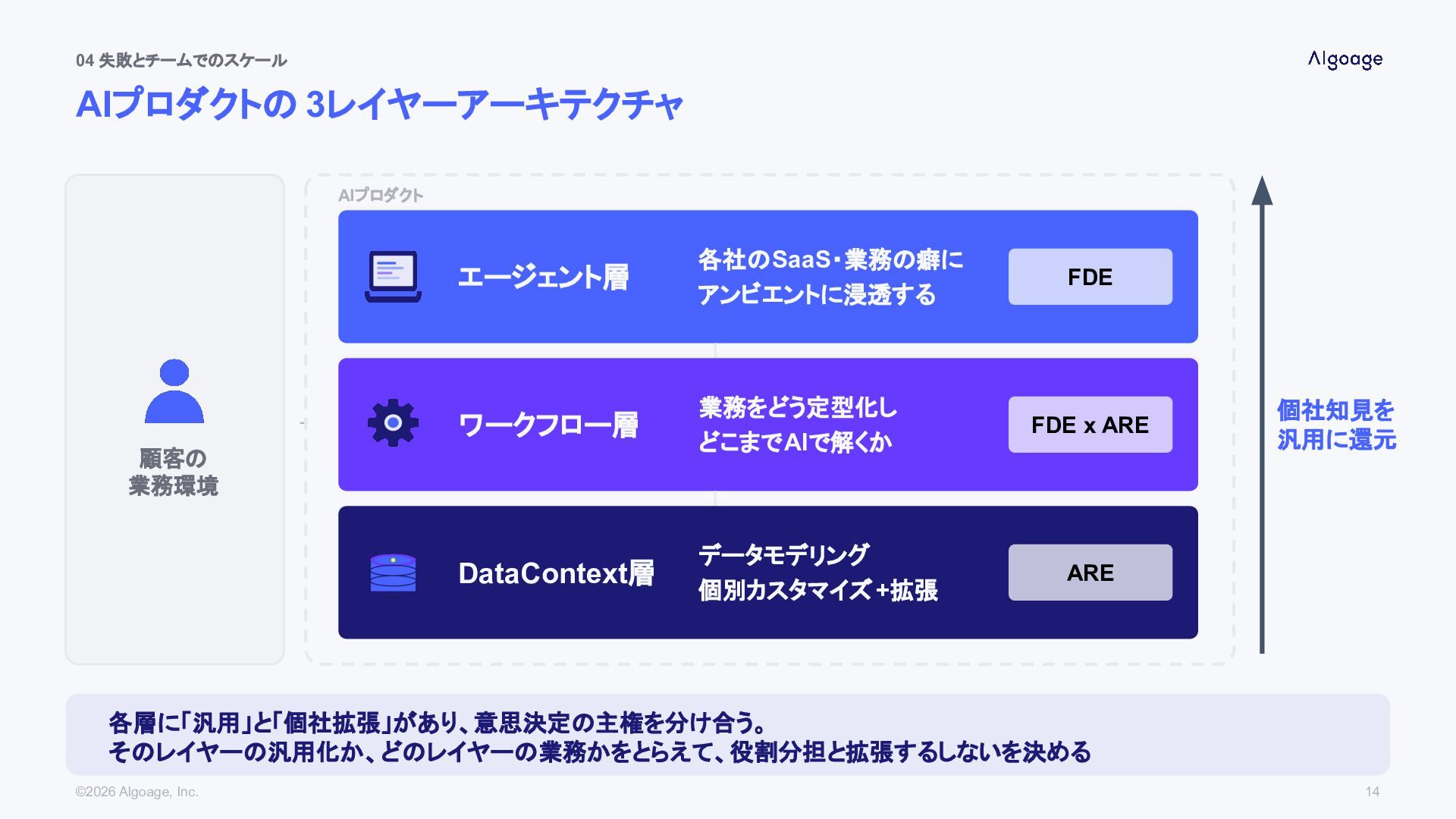 アンビエントに浸透する FDE ワークフロー層 業務をどう定型化し どこまでAIで解くか FDE x ARE DataContext層 データモデリング 個別カスタマイズ+拡張 ARE 個社知見を 汎用に還元 各層に「汎用」と「個社拡張」があり、意思決定の主権を分け合う。 そのレイヤーの汎用化か、どのレイヤーの業務かをとらえて、役割分担と拡張するしないを決める ©2026 Algoage, Inc. 14
