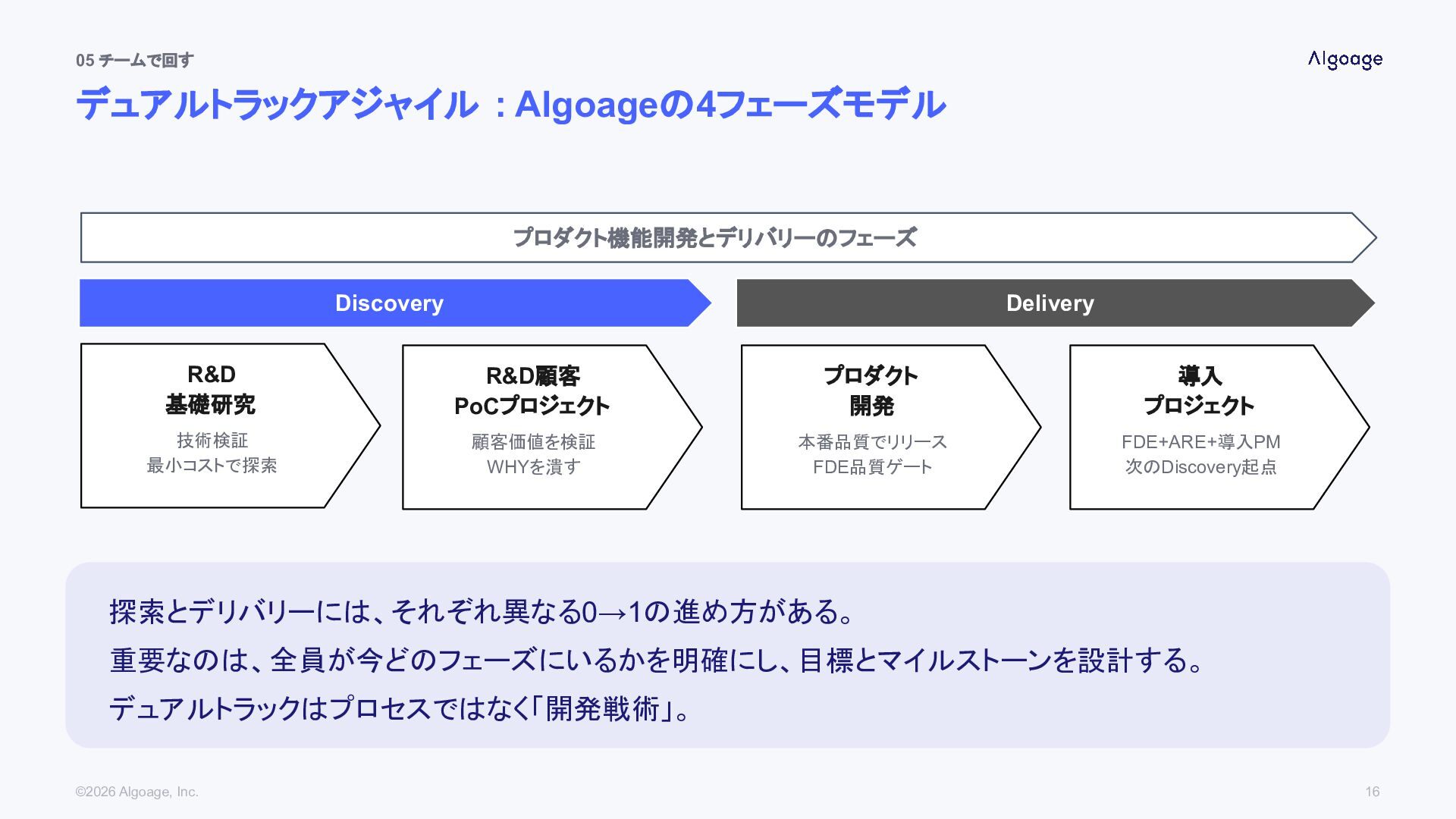 05 チームで回す デュアルトラックアジャイル : Algoageの4フェーズモデル ©2026 Algoage, Inc. 探索とデリバリーには、それぞれ異なる0→1の進め方がある。 重要なのは、全員が今どのフェーズにいるかを明確にし、目標とマイルストーンを設計する。