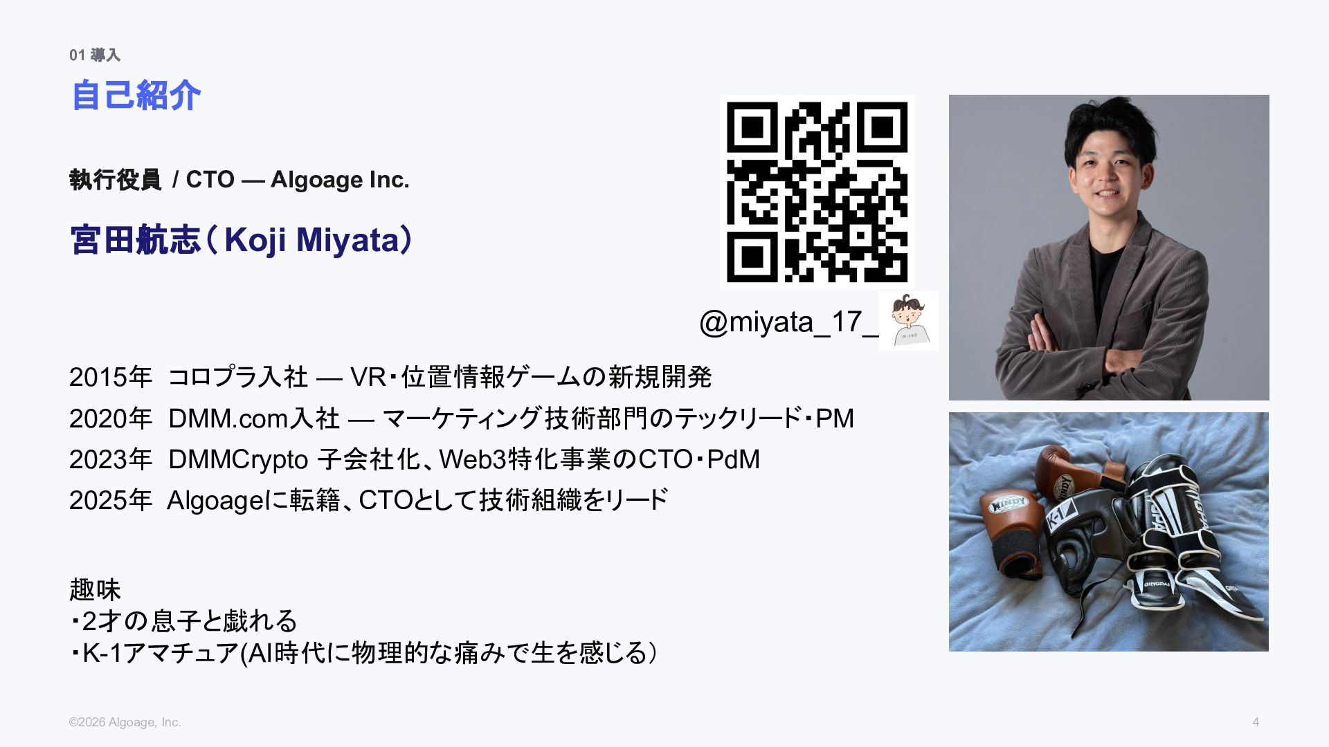 Koji Miyata) 2015年 コロプラ入社 — VR・位置情報ゲームの新規開発 2020年 DMM.com入社 — マーケティング技術部門のテックリード・PM 2023年 DMMCrypto 子会社化、Web3特化事業のCTO・PdM 2025年 Algoageに転籍、CTOとして技術組織をリード 趣味 ・2才の息子と戯れる ・K-1アマチュア(AI時代に物理的な痛みで生を感じる) ©2026 Algoage, Inc. 4 @miyata_17_