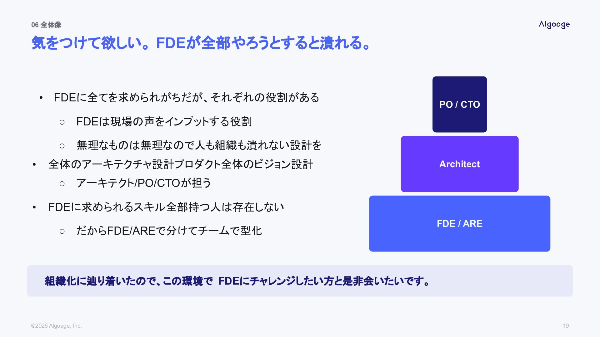 組織化の難しさとスケールの取り組み 05 FDEは1人のスーパーマンじゃない ©2026 Algoage, Inc. 2