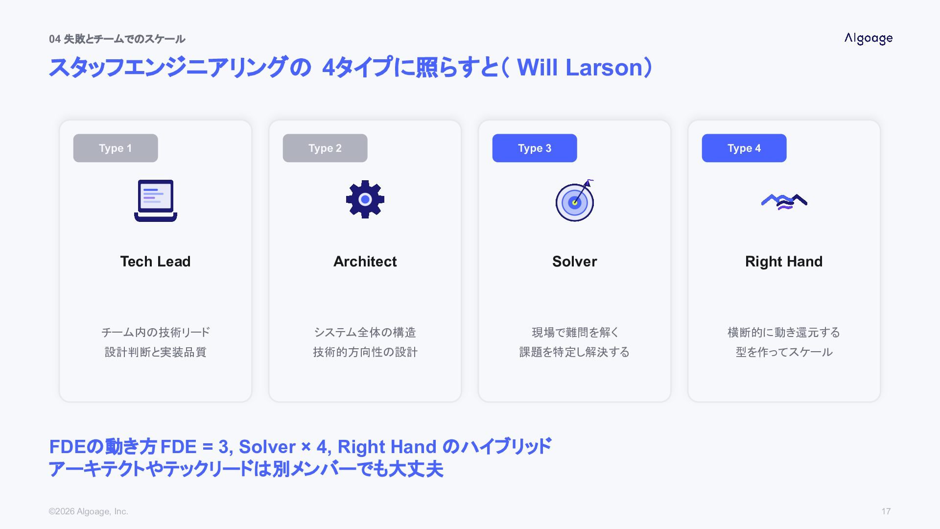 チーム内の技術リード 設計判断と実装品質 Type 2 Architect システム全体の構造 技術的方向性の設計 Type 3 Solver 現場で難問を解く 課題を特定し解決する Type 4 Right Hand 横断的に動き還元する 型を作ってスケール FDEの動き方FDE = 3, Solver × 4, Right Hand のハイブリッド アーキテクトやテックリードは別メンバーでも大丈夫 ©2026 Algoage, Inc. 17