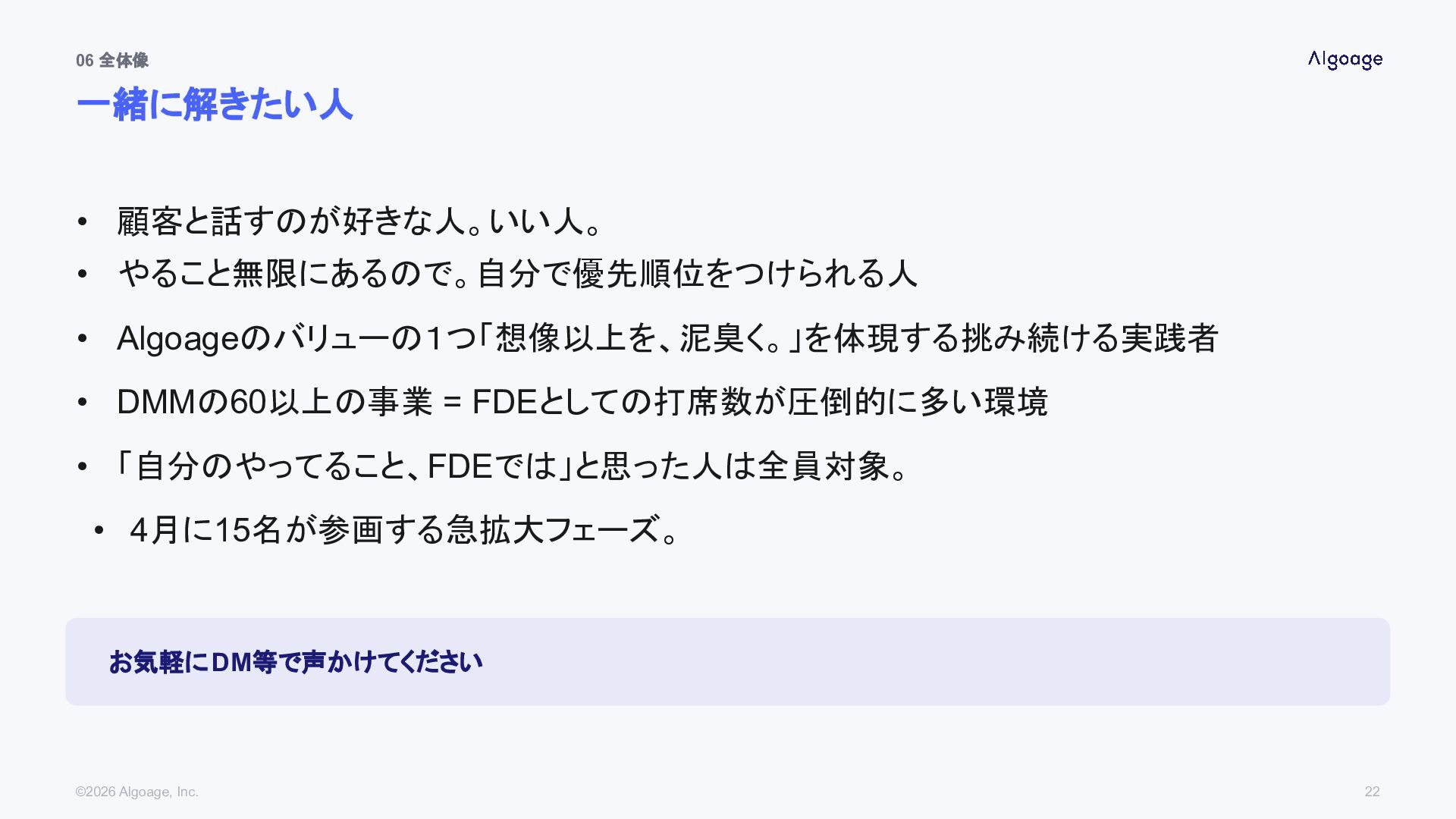 DMMの60以上の事業 = FDEとしての打席数が圧倒的に多い環境 • 「自分のやってること、FDEでは」と思った人は全員対象。 • 4月に15名が参画する急拡大フェーズ。 お気軽にDM等で声かけてください ©2026 Algoage, Inc. 22