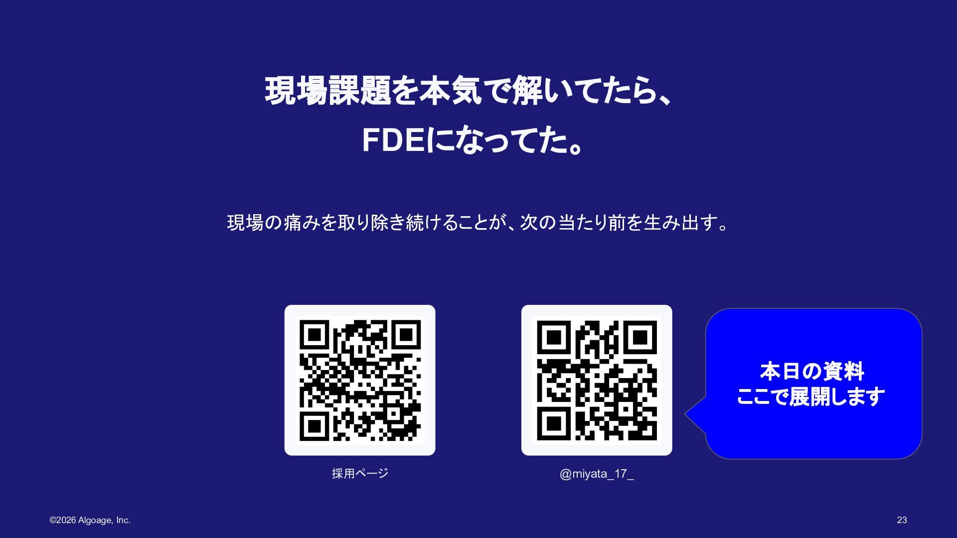 現場課題を本気で解いてたら、 FDEになってた。 現場の痛みを取り除き続けることが、次の当たり前を生み出す。 採用ページ @miyata_17_ ©2026 Algoage, Inc. 23 本日の資料