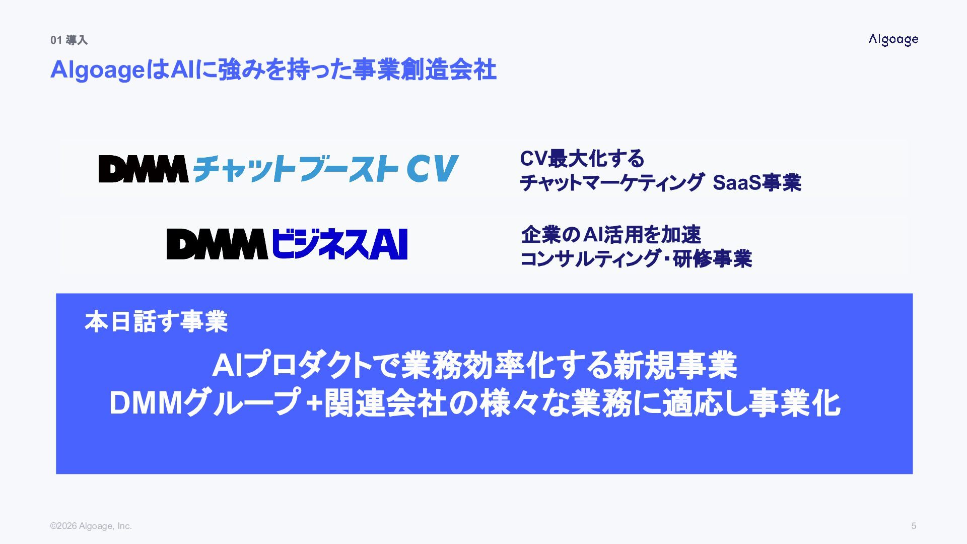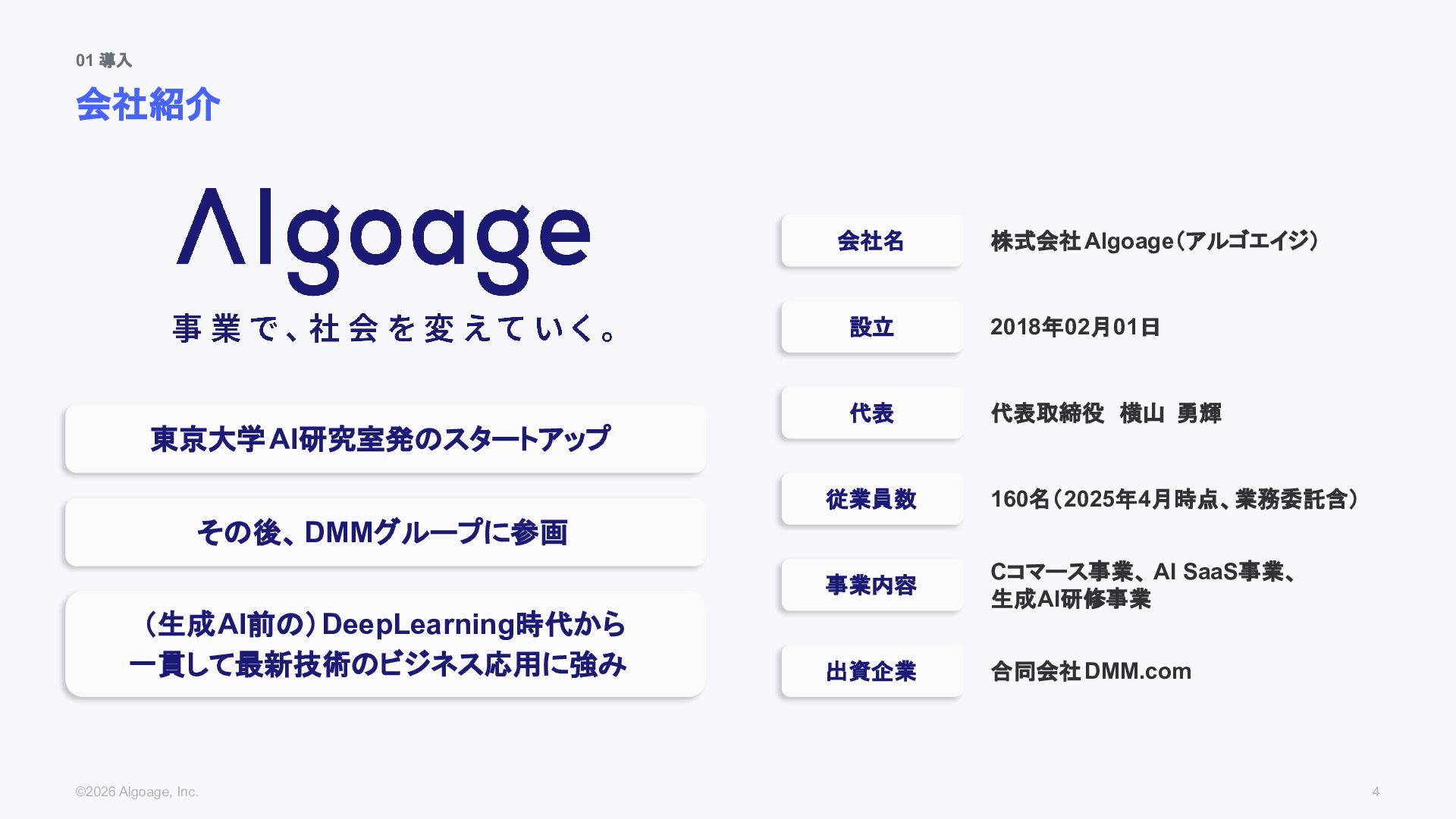 01 導入 会社紹介 ©2026 Algoage, Inc. 4 株式会社Algoage(アルゴエイジ) 会社名 設立
