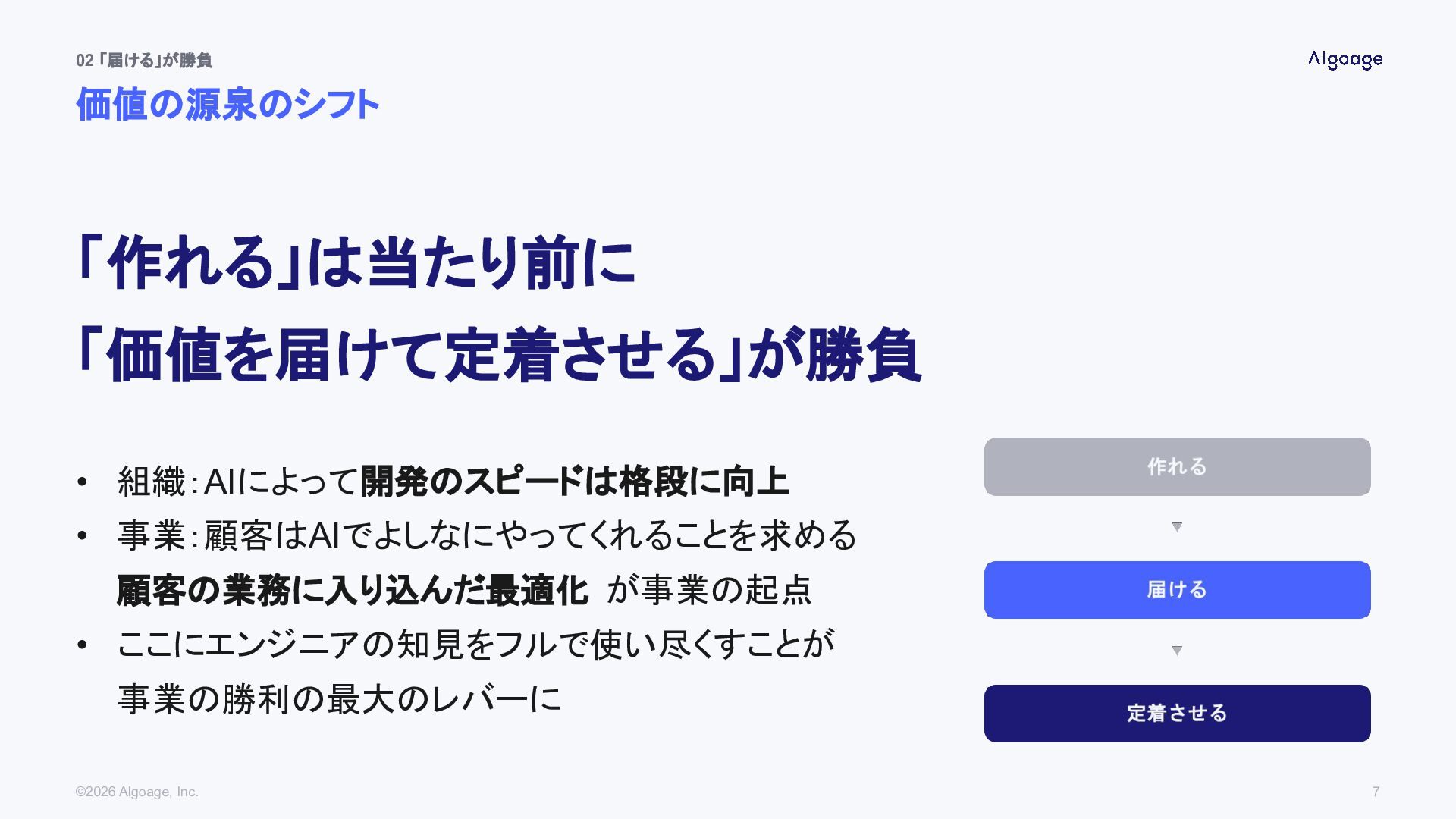 が事業の起点 • ここにエンジニアの知見をフルで使い尽くすことが 事業の勝利の最大のレバーに ©2026 Algoage, Inc. 7