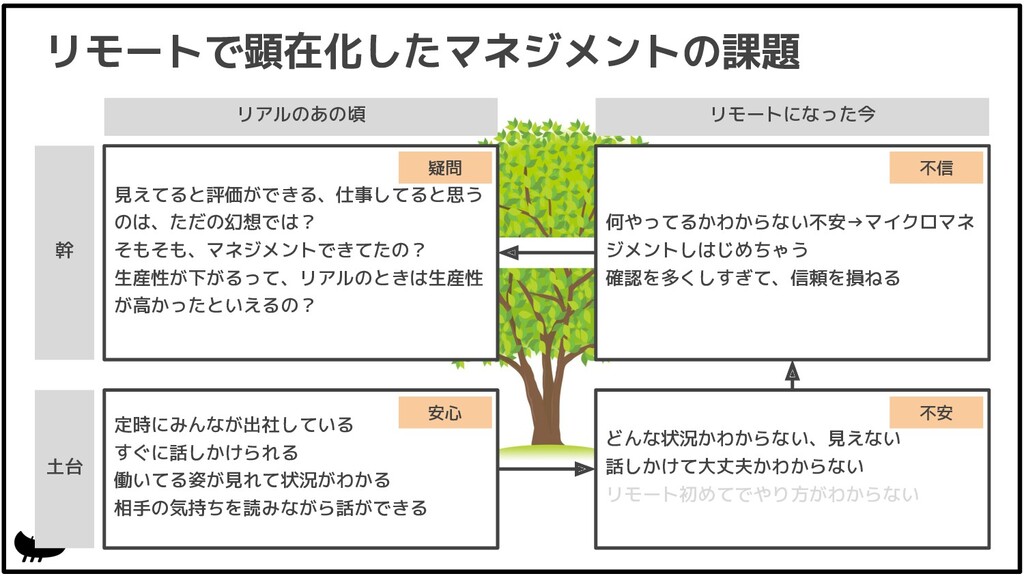 ・リモートワークにおけるマネジメントや評価はどのようにしていけばいいのか?という課題に対してのアイデア