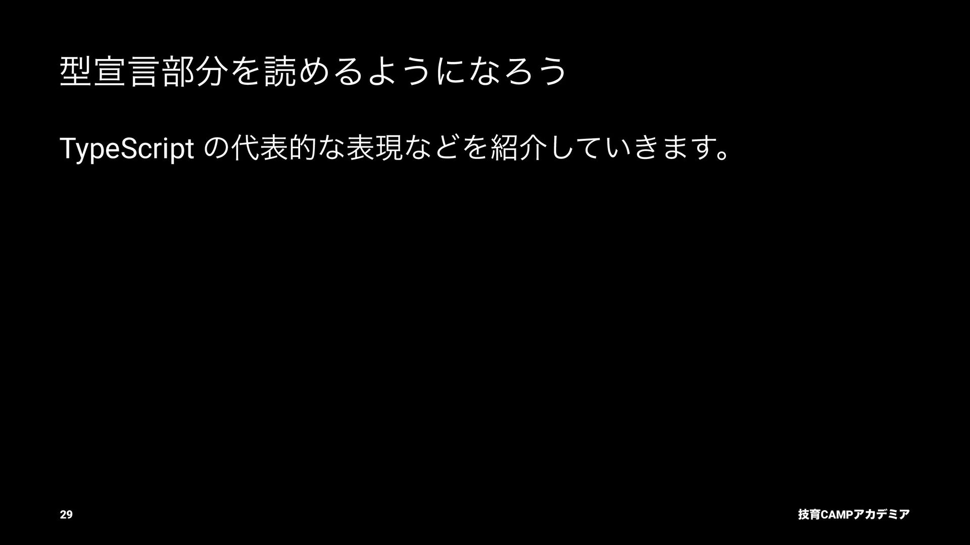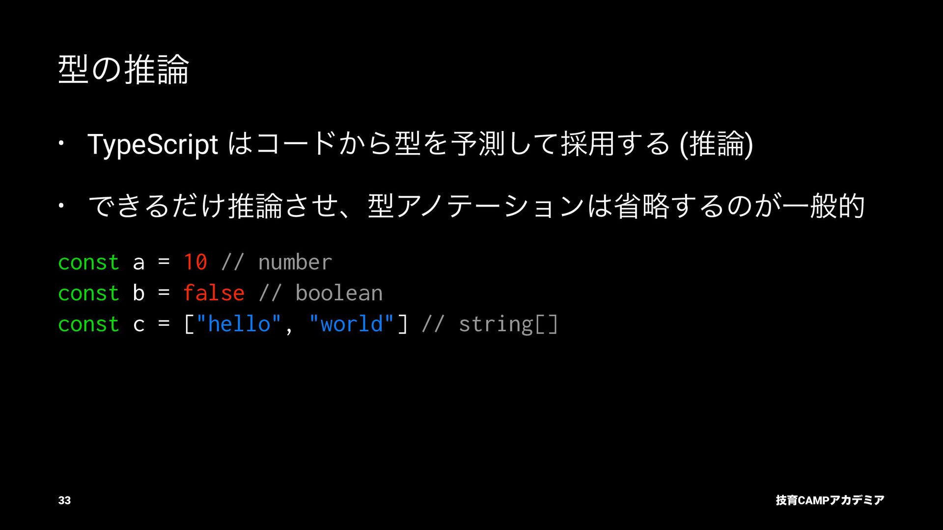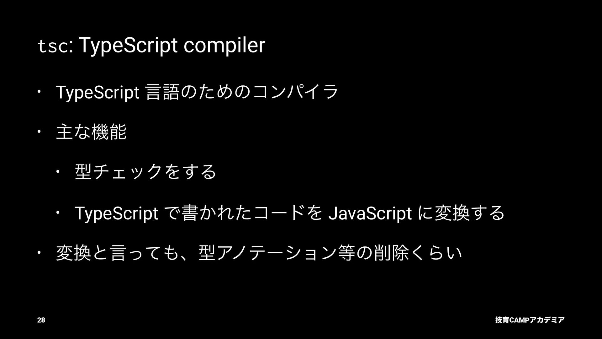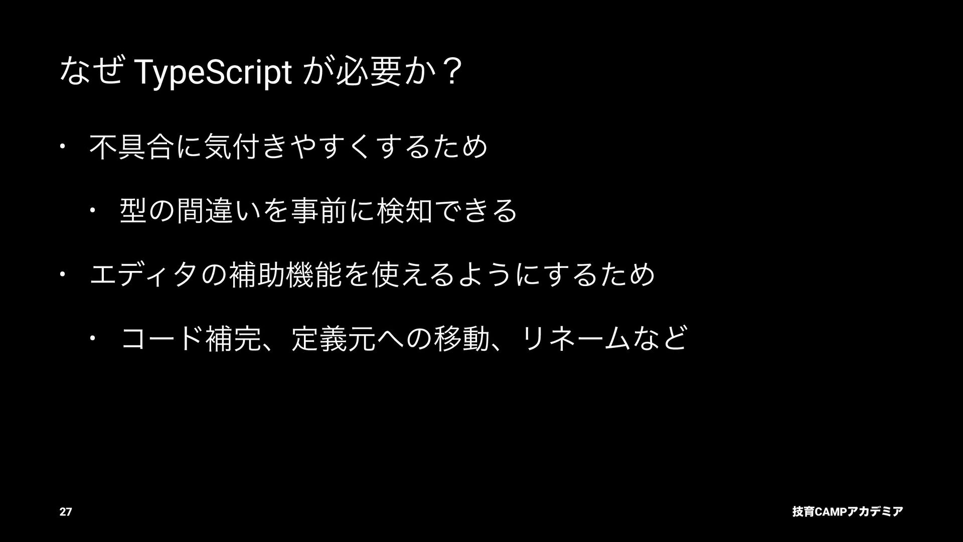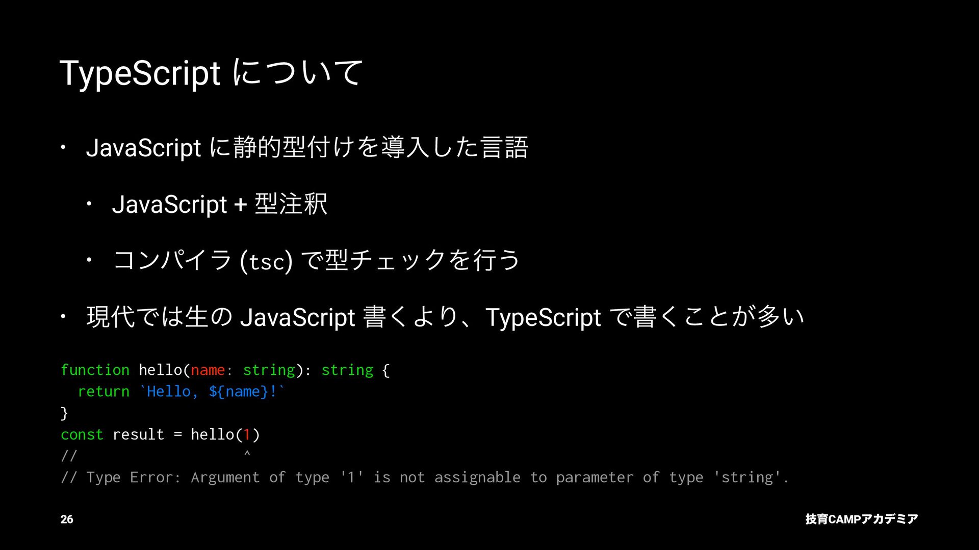 ίϯύΠϥ (tsc) ͰܕνΣοΫΛߦ͏ • ݱͰੜͷ JavaScript ॻ͘ΑΓɺTypeScript Ͱॻ͘͜ͱ͕ଟ͍ function hello(name: string): string { return `Hello, ${name}!` } const result = hello(1) // ^ // Type Error: Argument of type '1' is not assignable to parameter of type 'string'. ٕҭCAMPΞΧσϛΞ 26