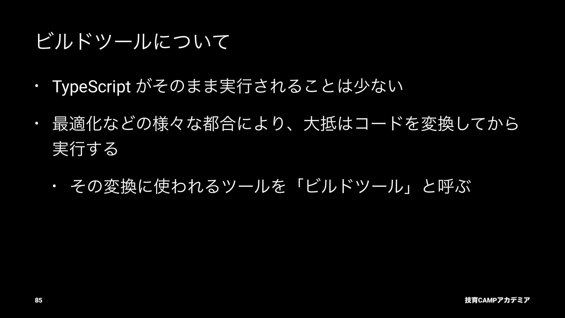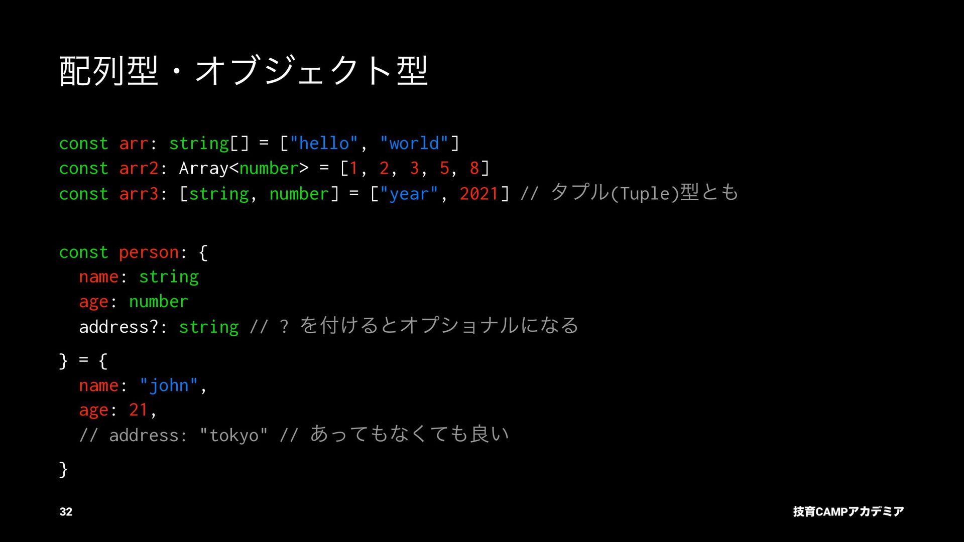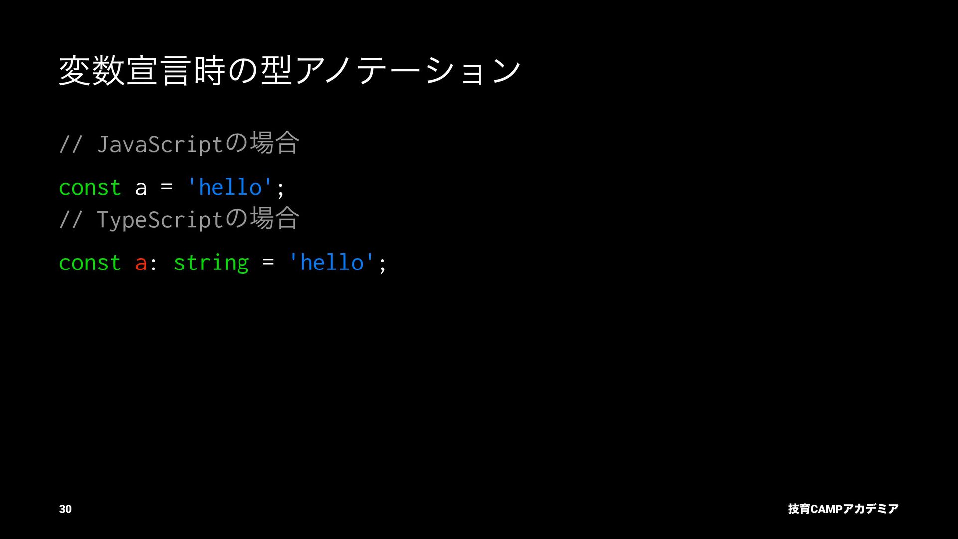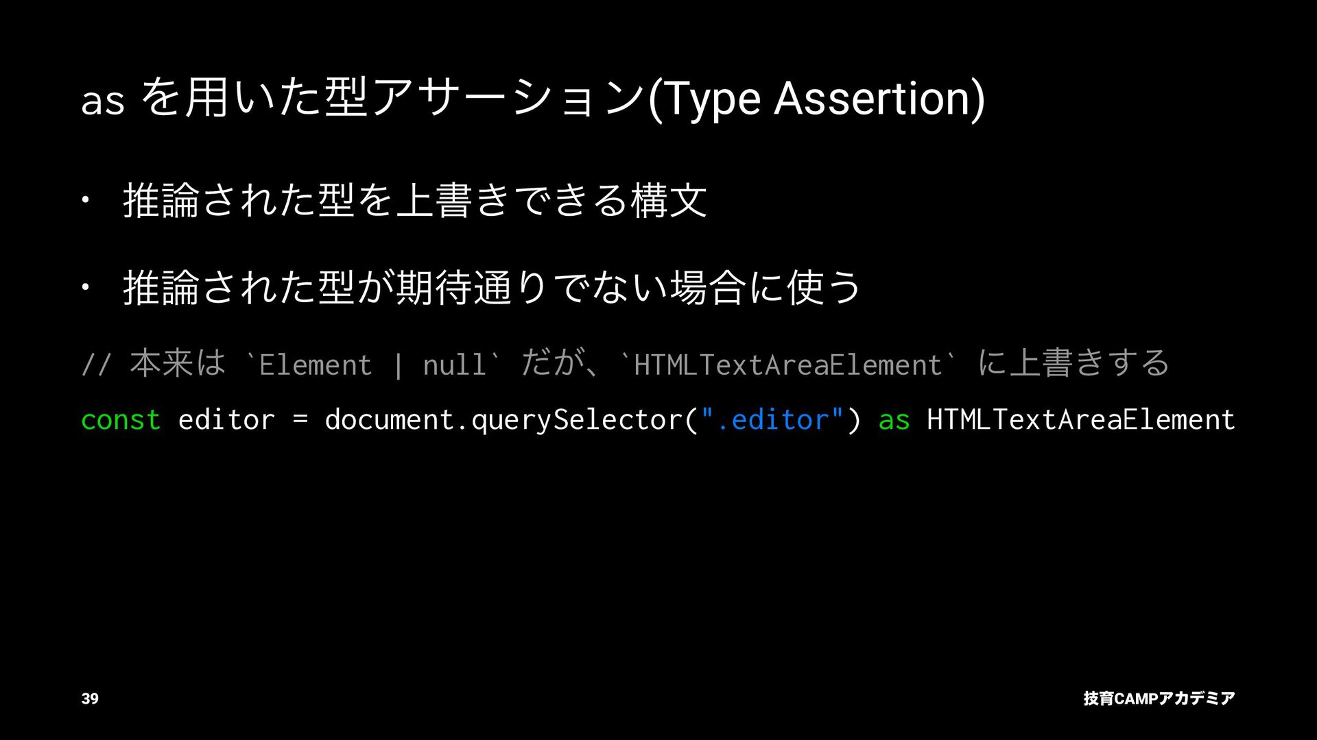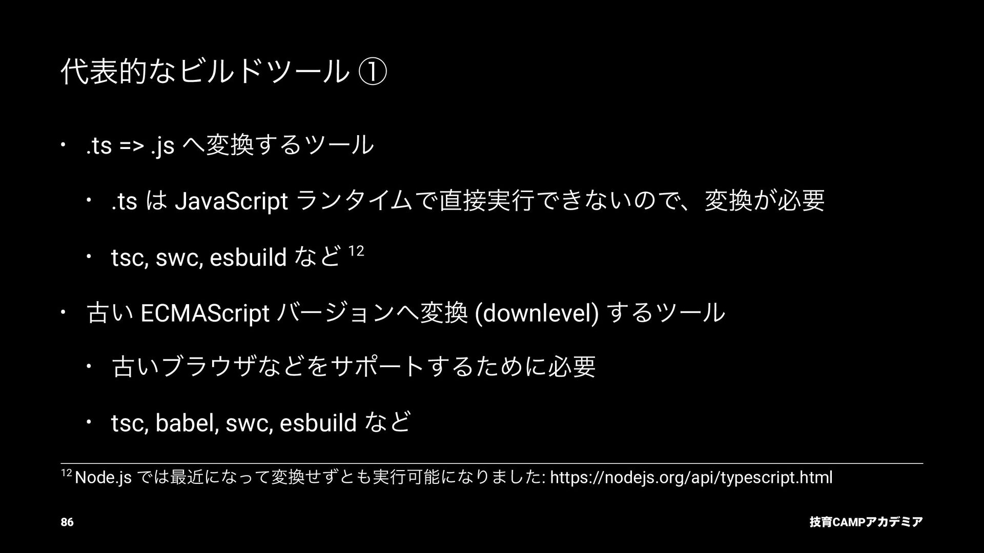 ίϯύΠϥ (tsc) ͰܕνΣοΫΛߦ͏ • ݱͰੜͷ JavaScript ॻ͘ΑΓɺTypeScript Ͱॻ͘͜ͱ͕ଟ͍ function hello(name: string): string { return `Hello, ${name}!` } const result = hello(1) // ^ // Type Error: Argument of type '1' is not assignable to parameter of type 'string'. ٕҭCAMPΞΧσϛΞ 26