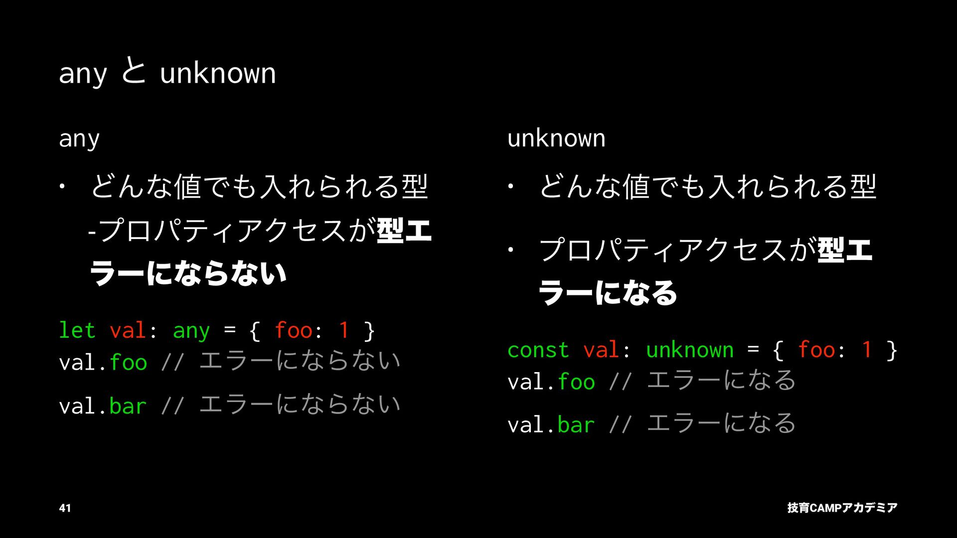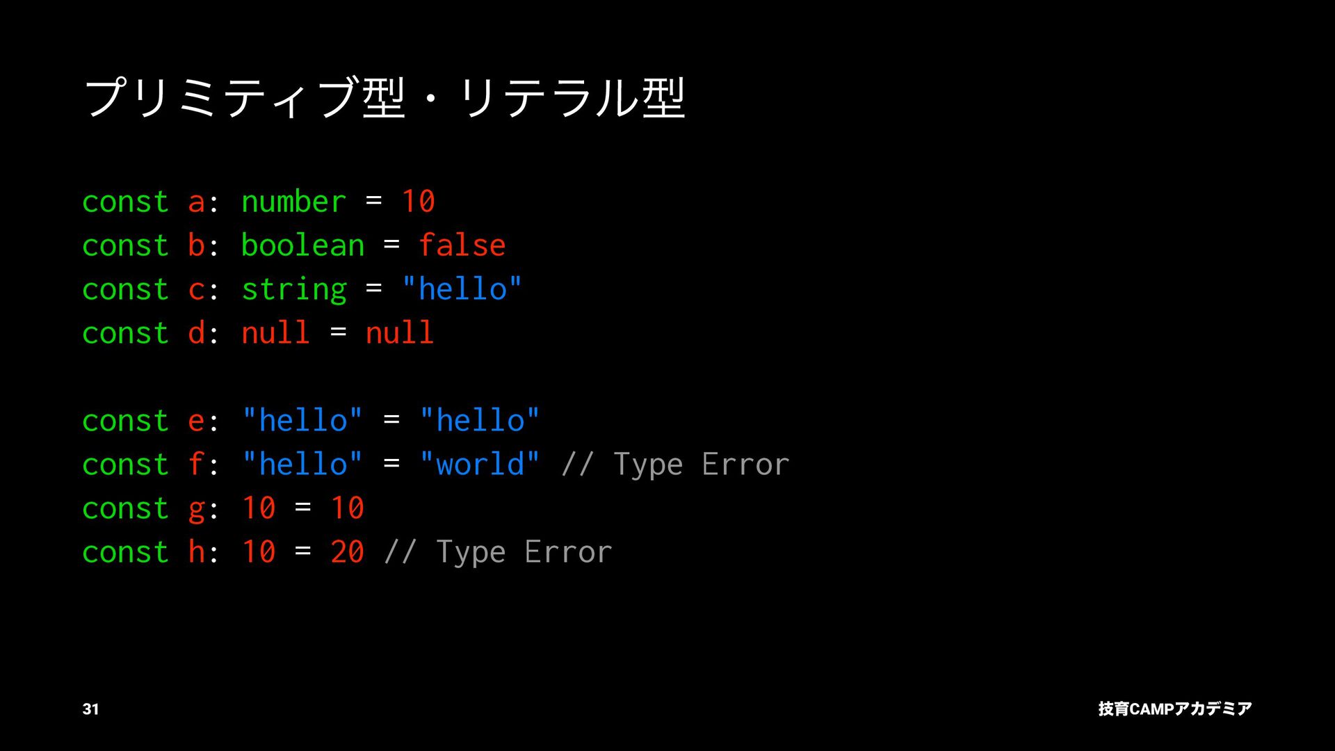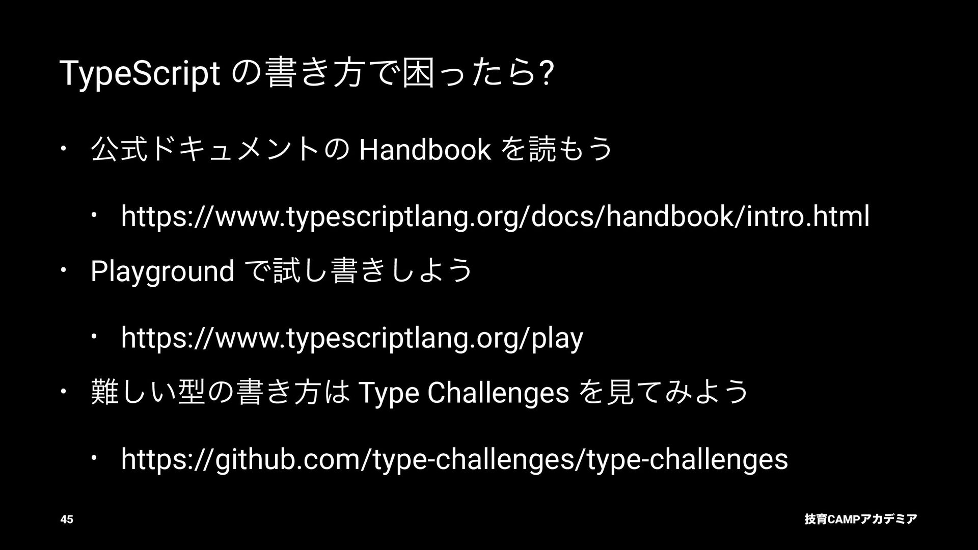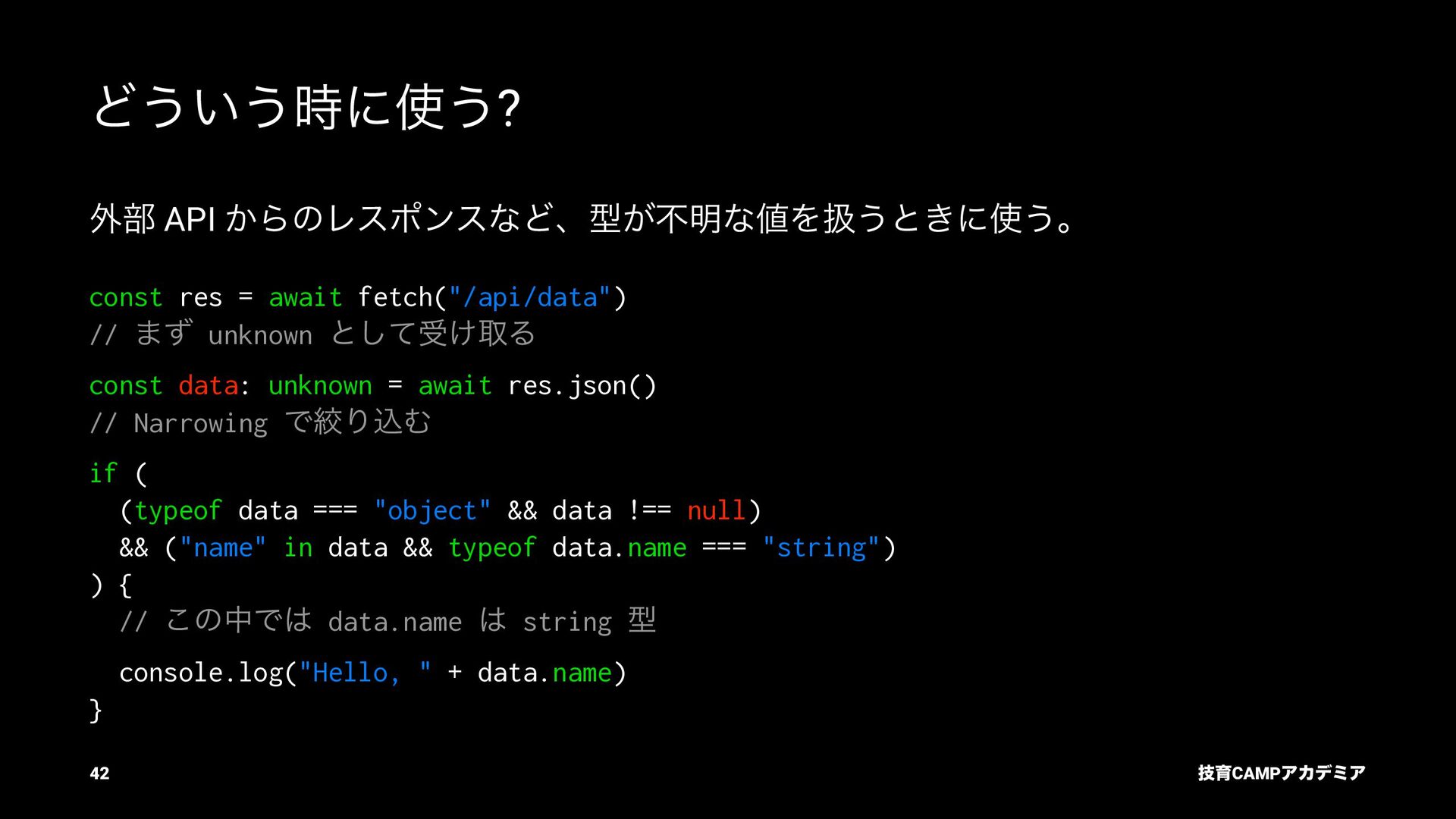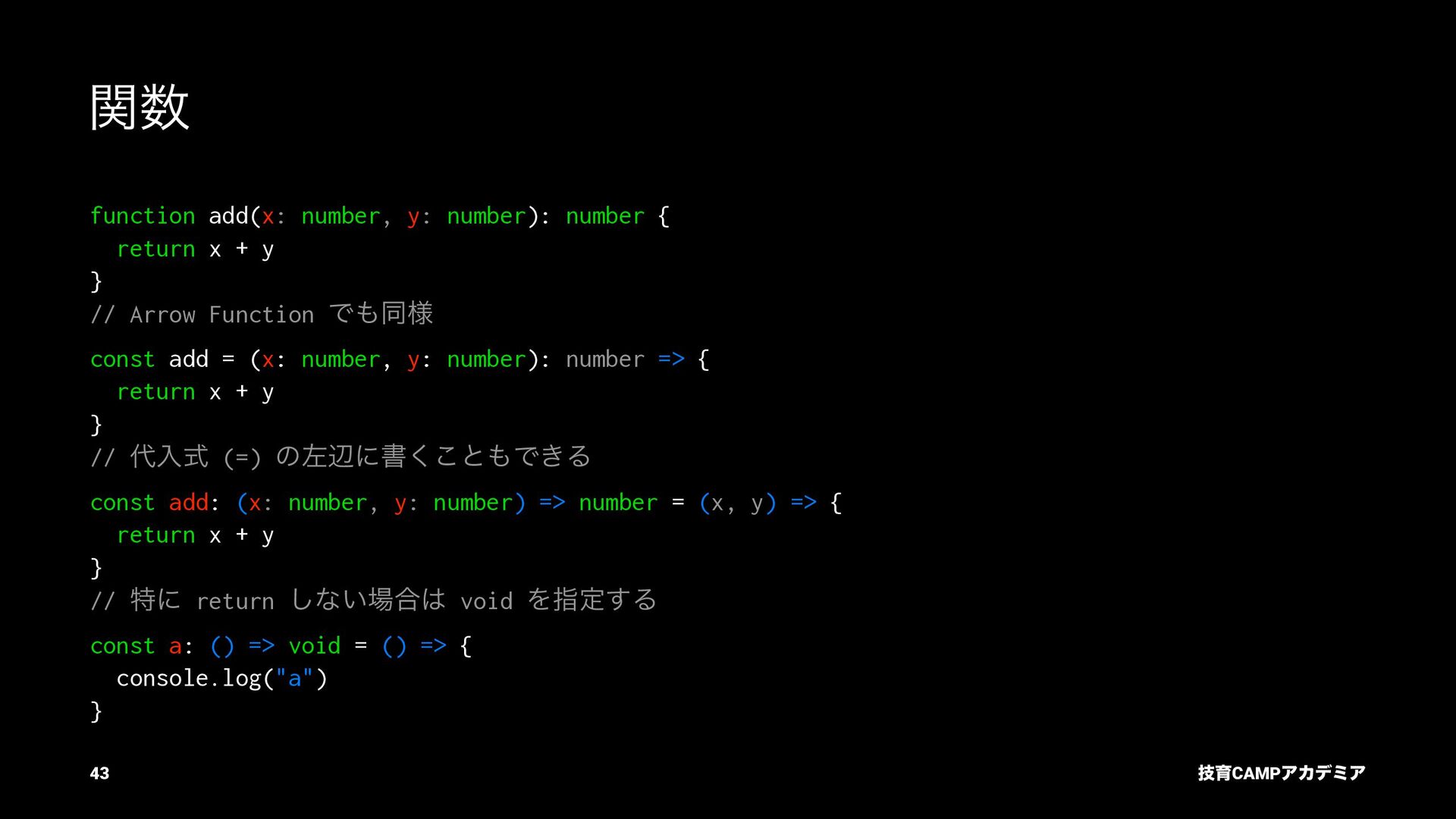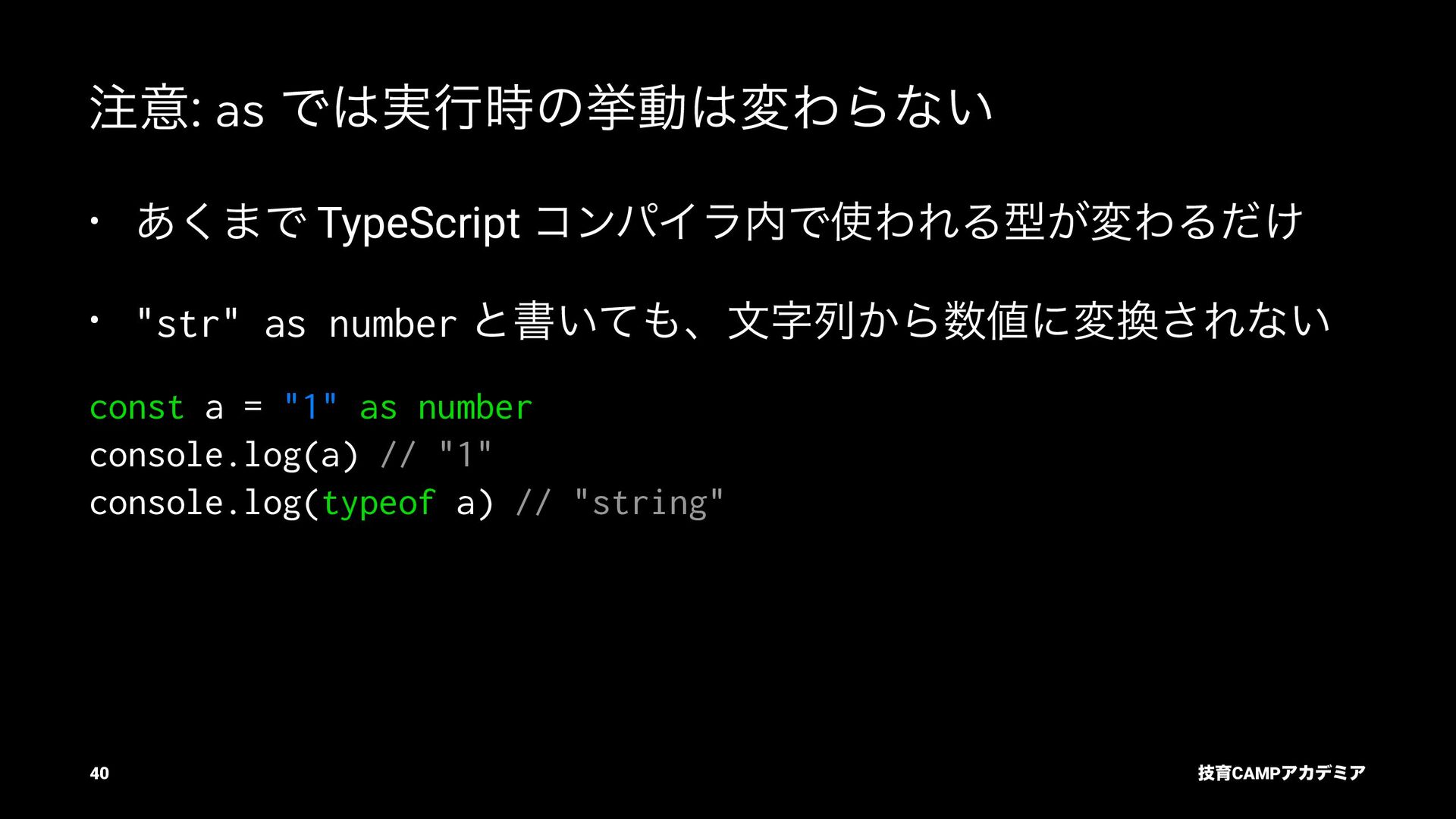 ίϯύΠϥ (tsc) ͰܕνΣοΫΛߦ͏ • ݱͰੜͷ JavaScript ॻ͘ΑΓɺTypeScript Ͱॻ͘͜ͱ͕ଟ͍ function hello(name: string): string { return `Hello, ${name}!` } const result = hello(1) // ^ // Type Error: Argument of type '1' is not assignable to parameter of type 'string'. ٕҭCAMPΞΧσϛΞ 26