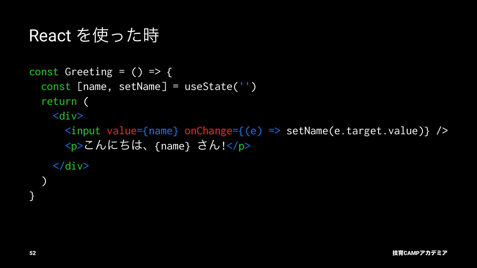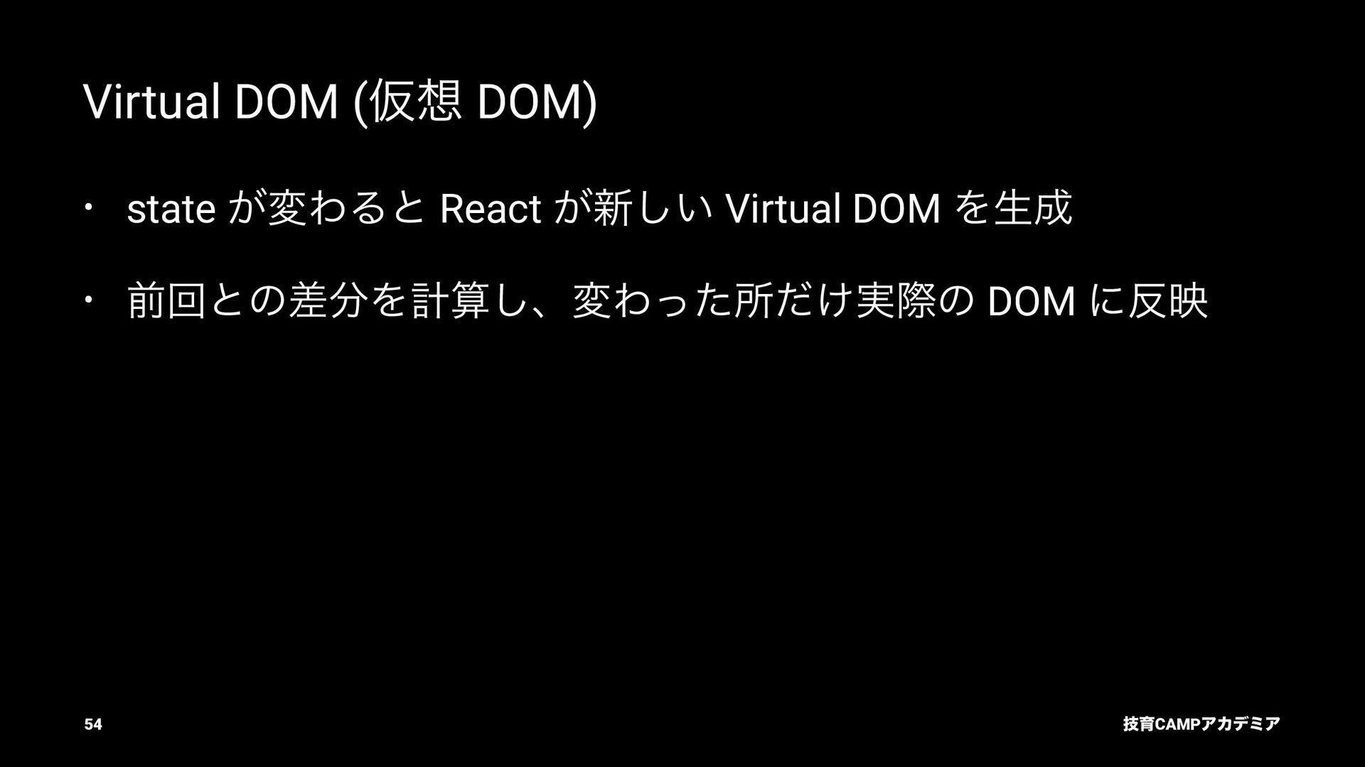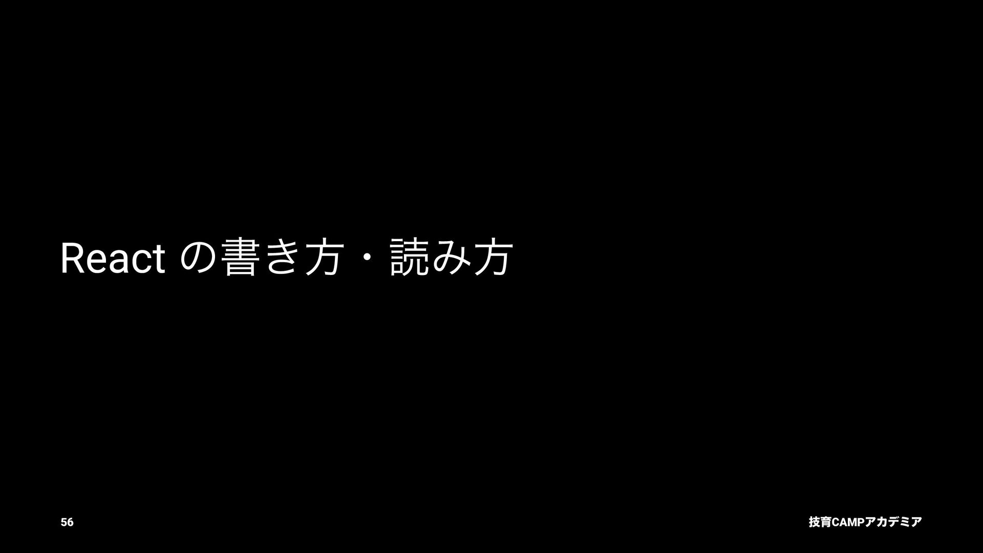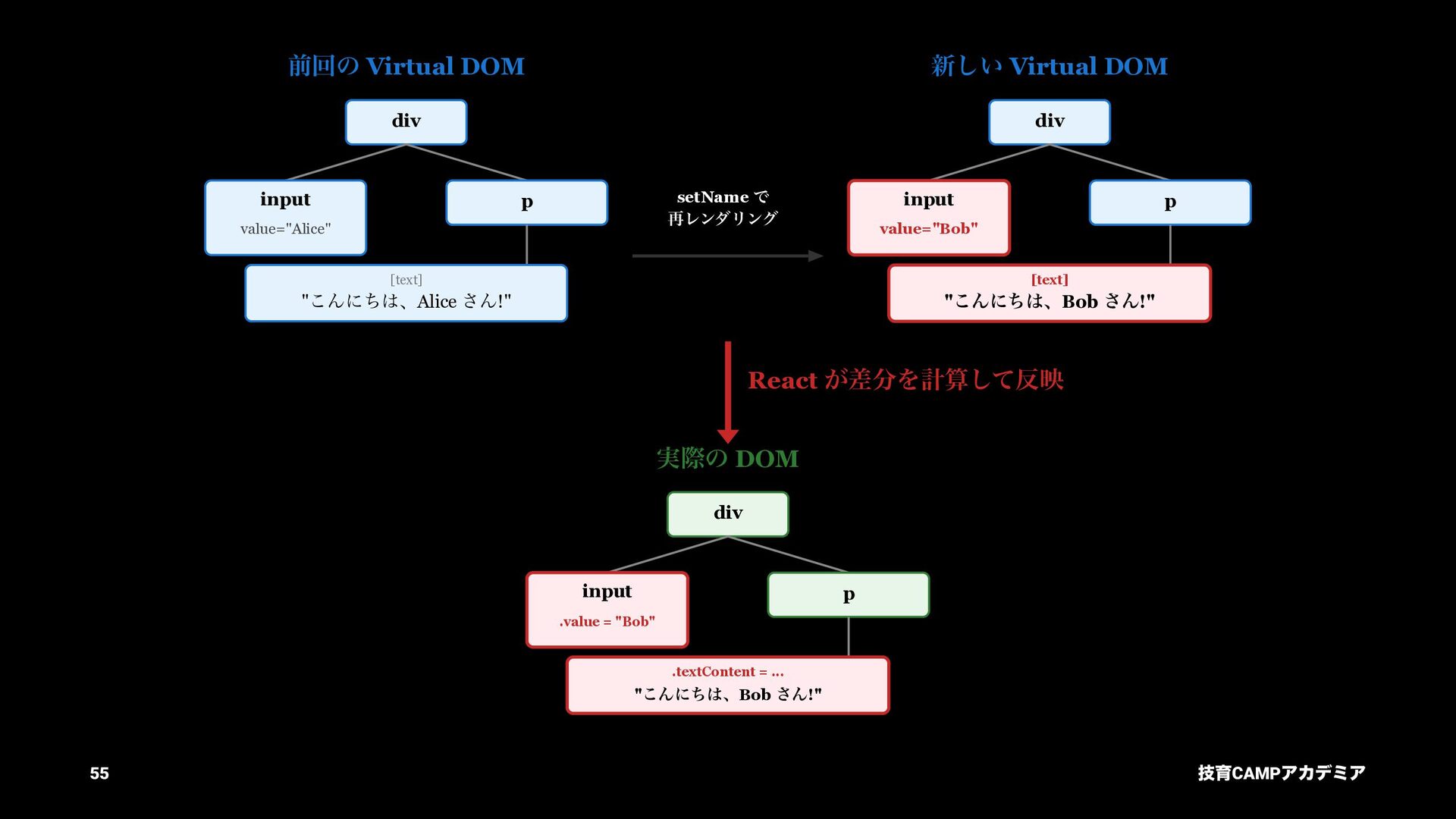 setName Ͱ ࠶ϨϯμϦϯά ৽͍͠ Virtual DOM div input value="Bob" p [text] "͜ΜʹͪɺBob ͞Μ!" React ͕ࠩΛܭࢉͯ͠ө ࣮ࡍͷ DOM div input .value = "Bob" p .textContent = ... "͜ΜʹͪɺBob ͞Μ!" ٕҭCAMPΞΧσϛΞ 55