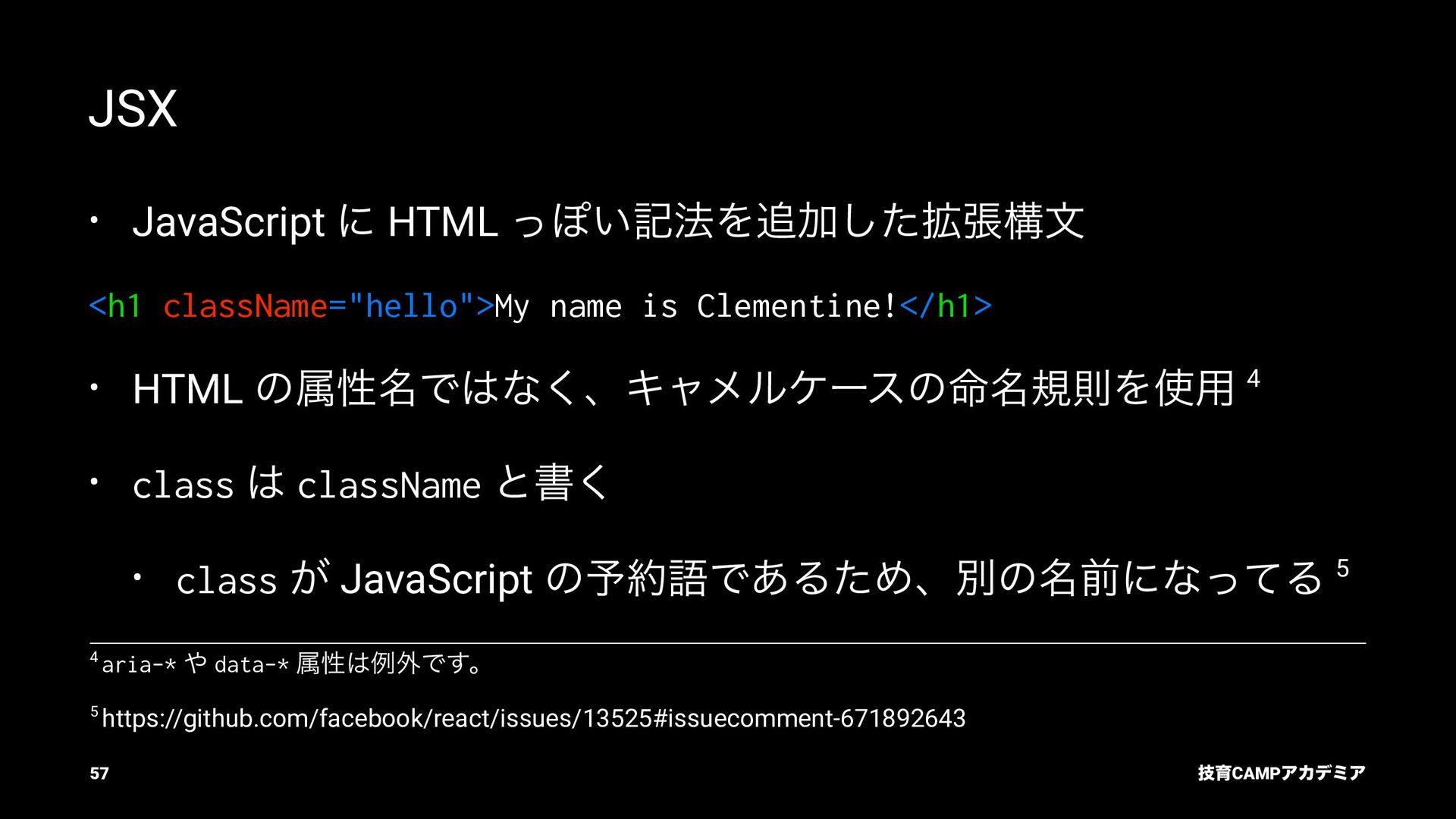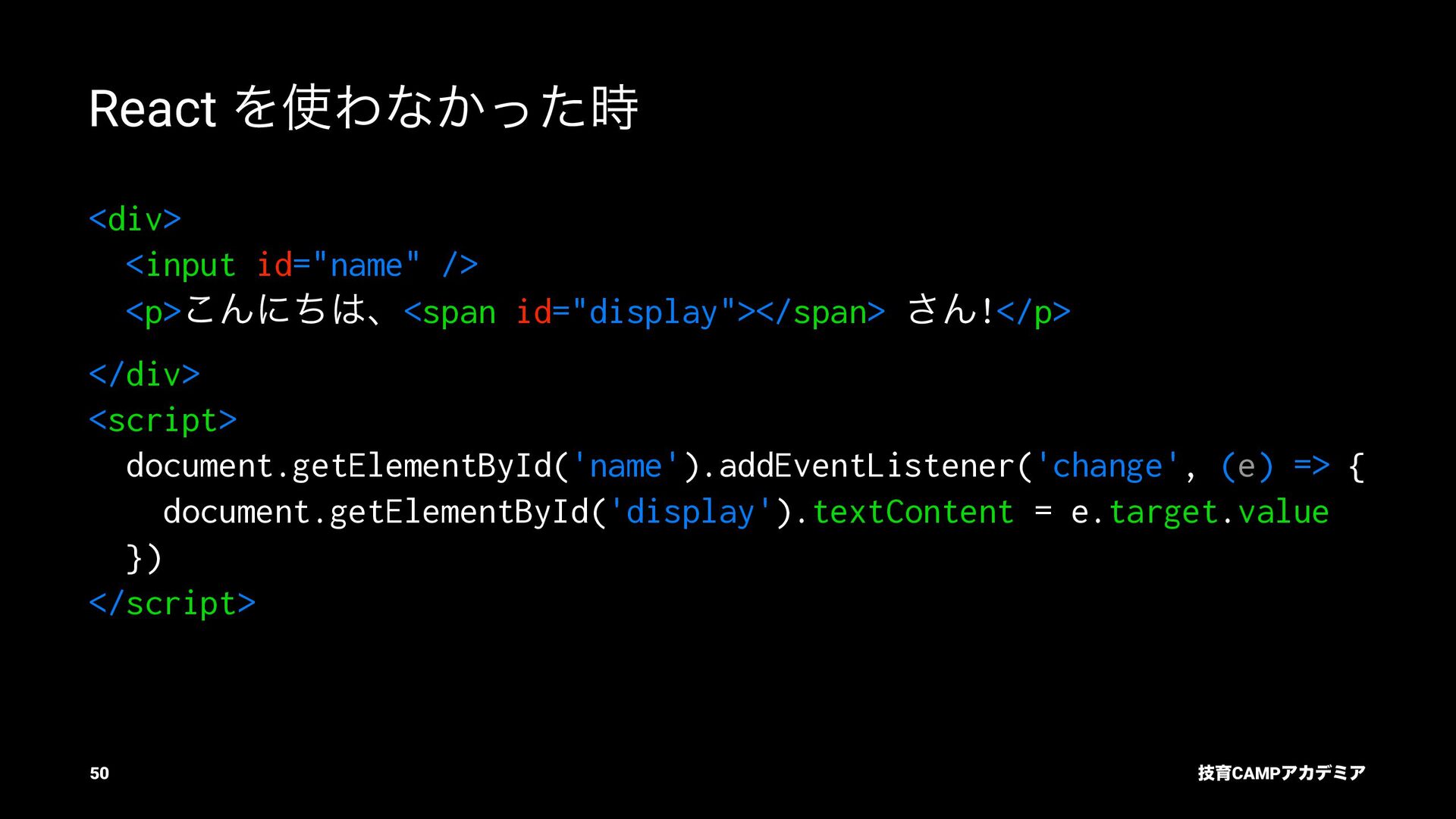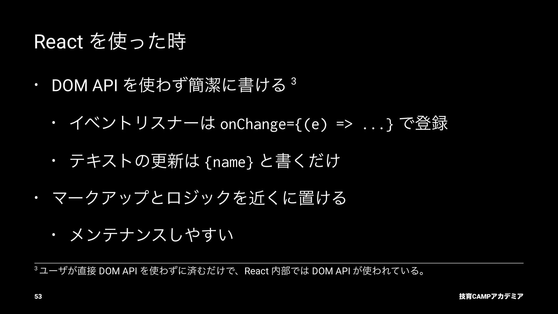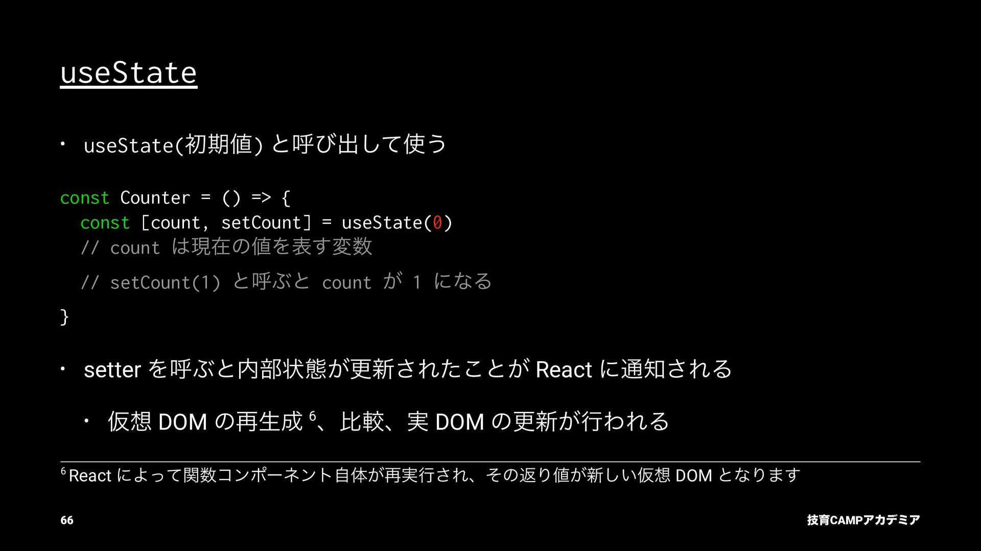 setName Ͱ ࠶ϨϯμϦϯά ৽͍͠ Virtual DOM div input value="Bob" p [text] "͜ΜʹͪɺBob ͞Μ!" React ͕ࠩΛܭࢉͯ͠ө ࣮ࡍͷ DOM div input .value = "Bob" p .textContent = ... "͜ΜʹͪɺBob ͞Μ!" ٕҭCAMPΞΧσϛΞ 55