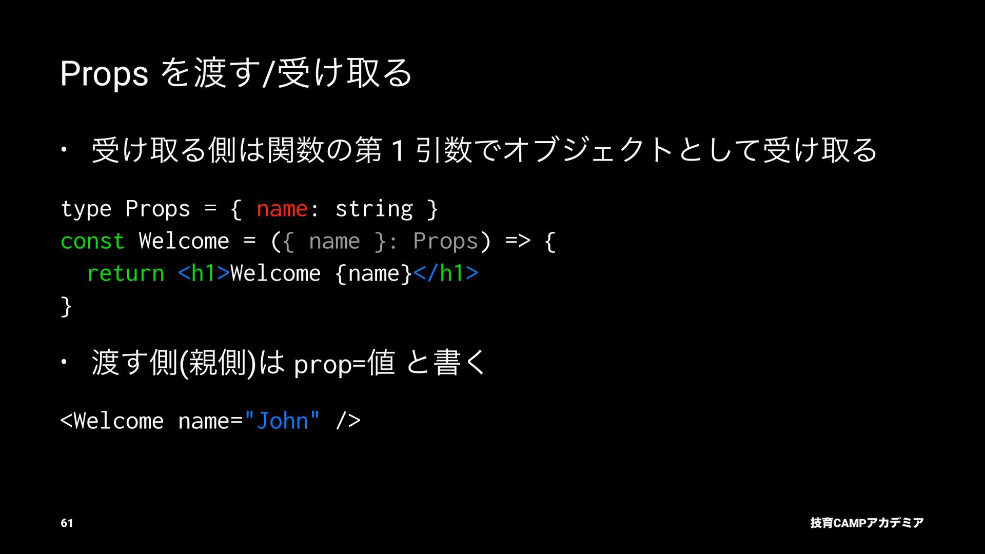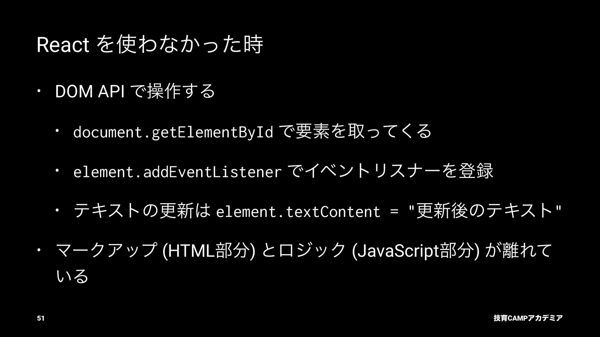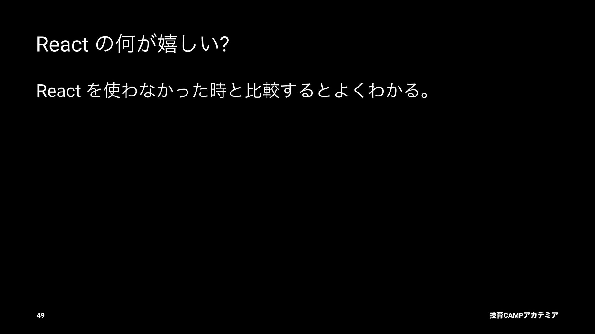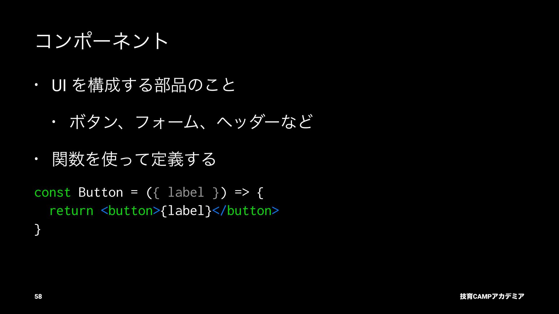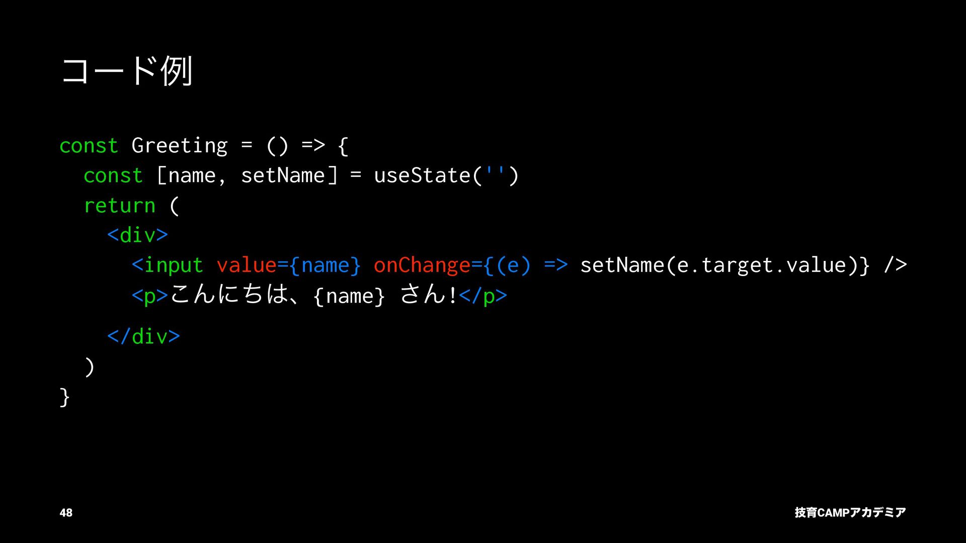 setName Ͱ ࠶ϨϯμϦϯά ৽͍͠ Virtual DOM div input value="Bob" p [text] "͜ΜʹͪɺBob ͞Μ!" React ͕ࠩΛܭࢉͯ͠ө ࣮ࡍͷ DOM div input .value = "Bob" p .textContent = ... "͜ΜʹͪɺBob ͞Μ!" ٕҭCAMPΞΧσϛΞ 55