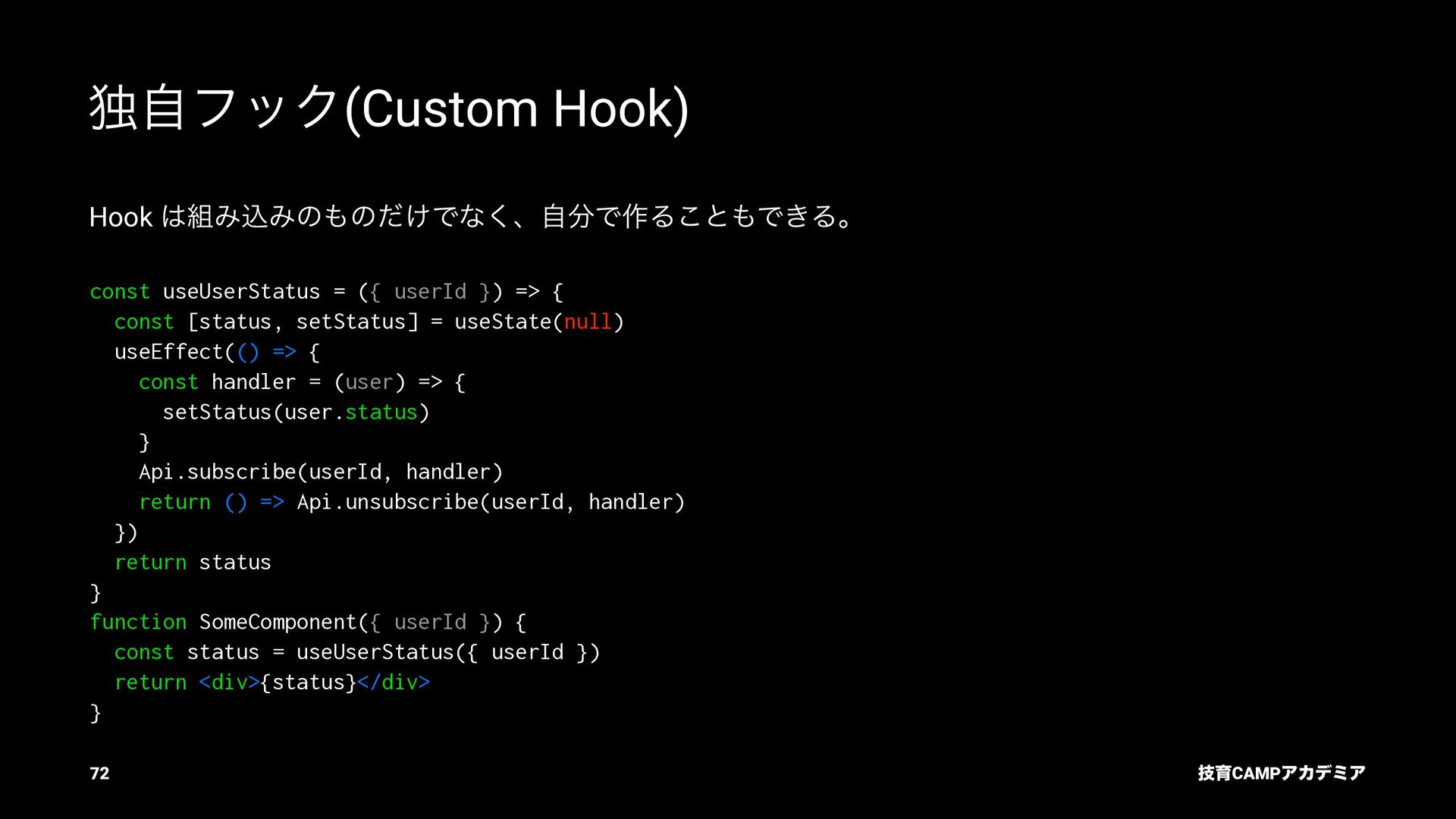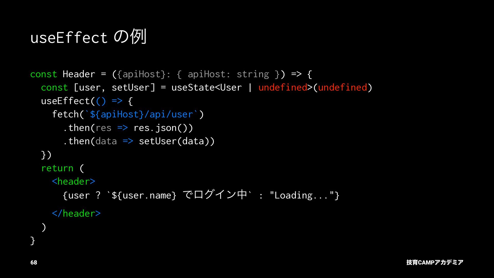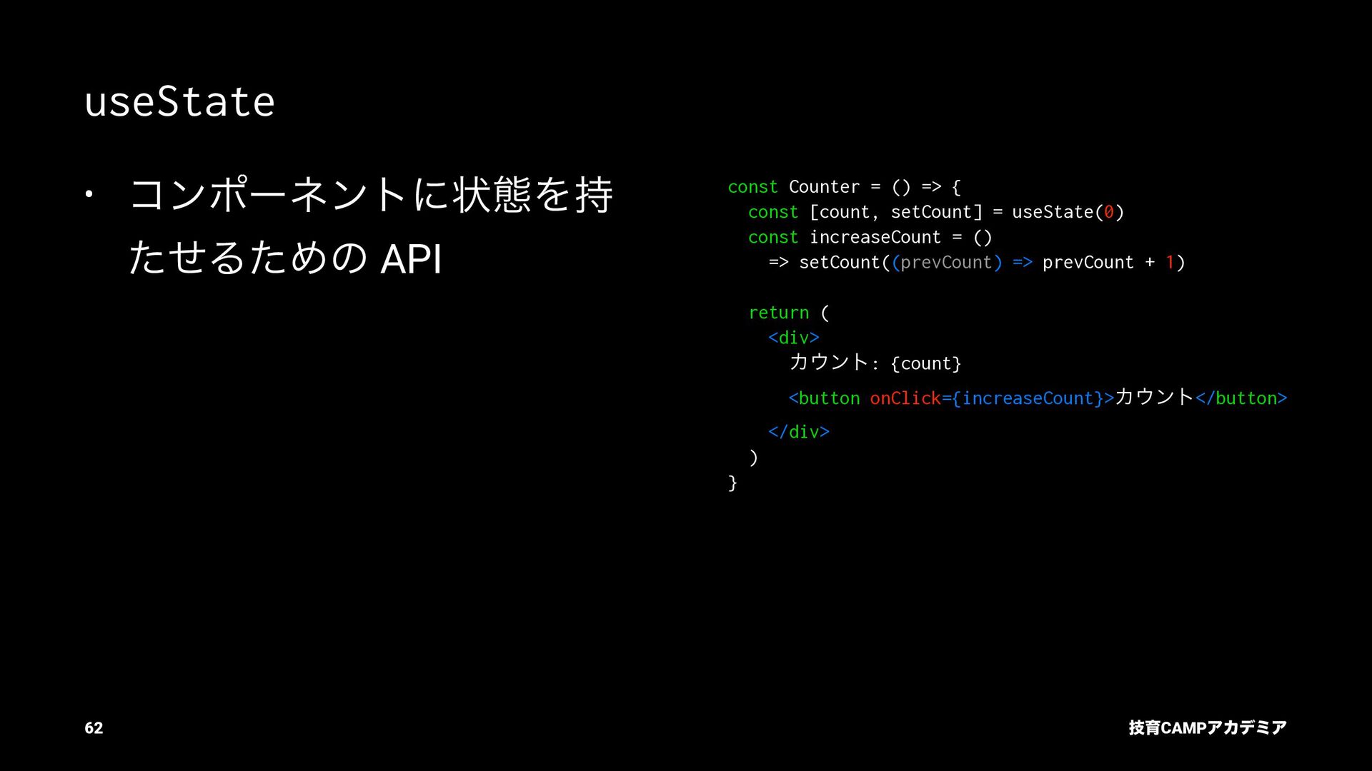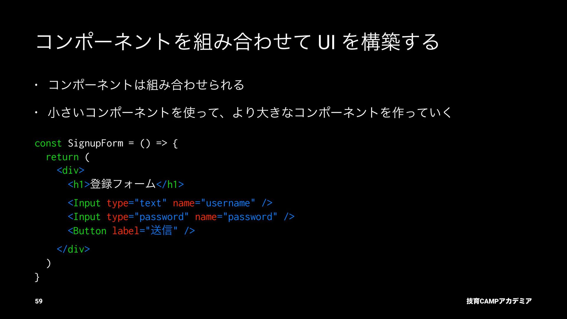 setName Ͱ ࠶ϨϯμϦϯά ৽͍͠ Virtual DOM div input value="Bob" p [text] "͜ΜʹͪɺBob ͞Μ!" React ͕ࠩΛܭࢉͯ͠ө ࣮ࡍͷ DOM div input .value = "Bob" p .textContent = ... "͜ΜʹͪɺBob ͞Μ!" ٕҭCAMPΞΧσϛΞ 55