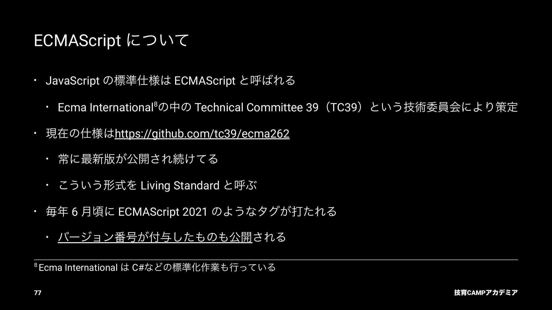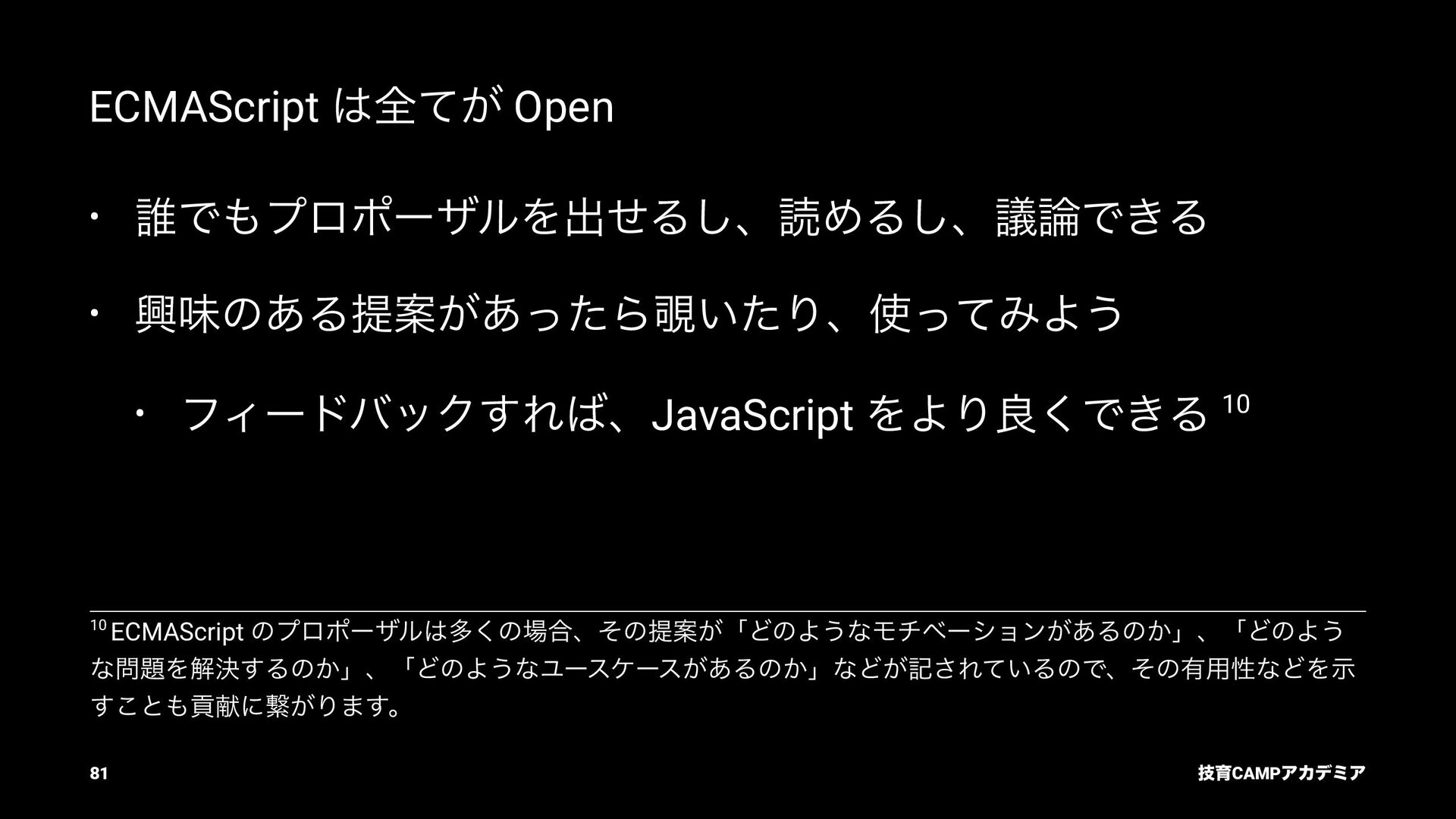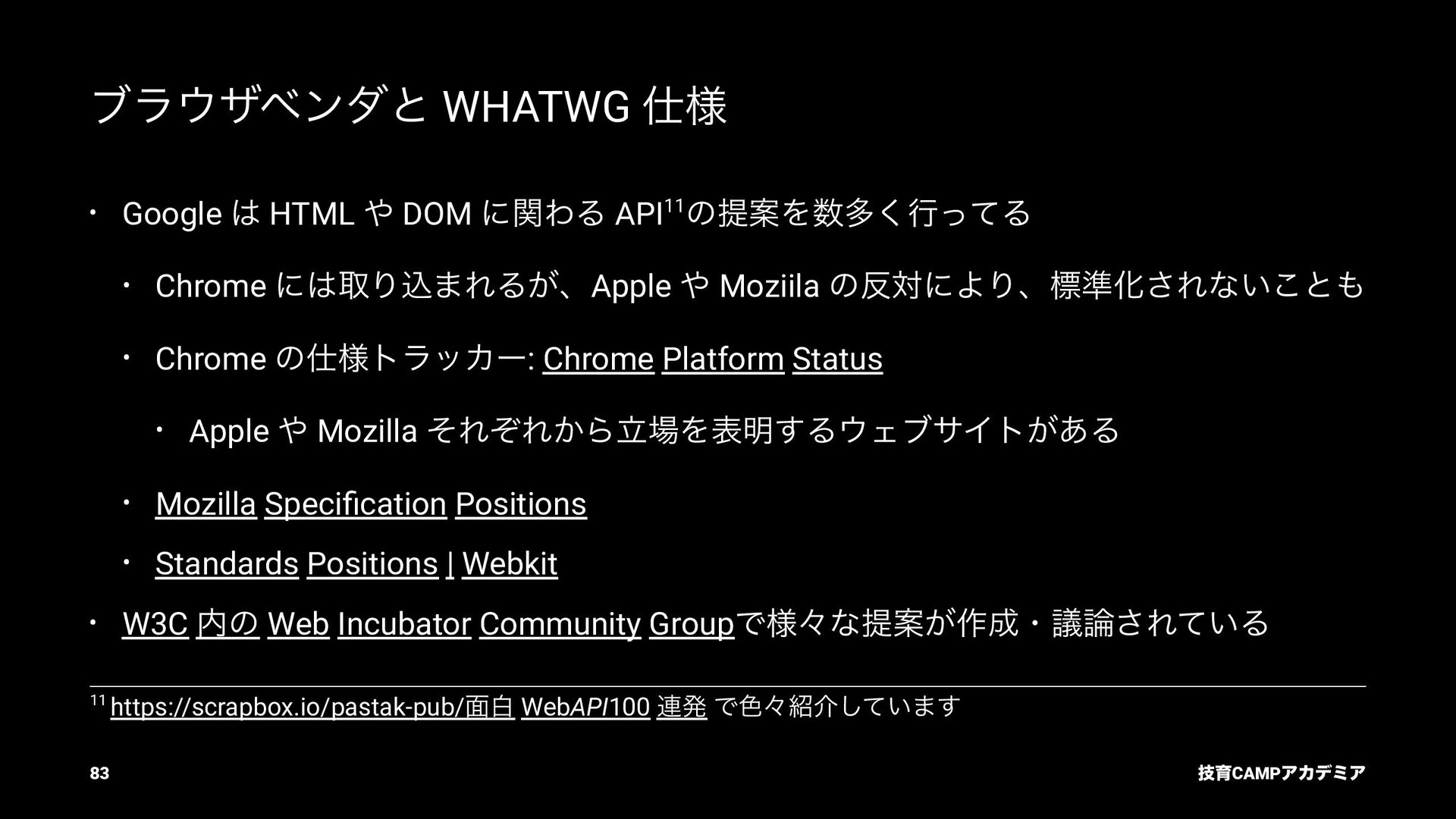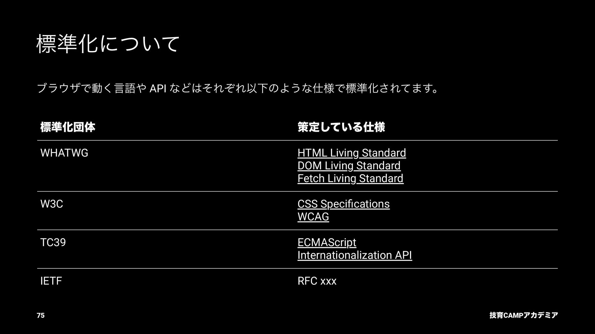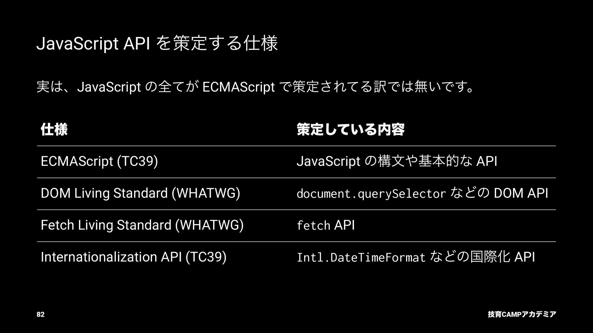 (TC39) JavaScript ͷߏจجຊతͳ API DOM Living Standard (WHATWG) document.querySelector ͳͲͷ DOM API Fetch Living Standard (WHATWG) fetch API Internationalization API (TC39) Intl.DateTimeFormat ͳͲͷࠃࡍԽ API ٕҭCAMPΞΧσϛΞ 82