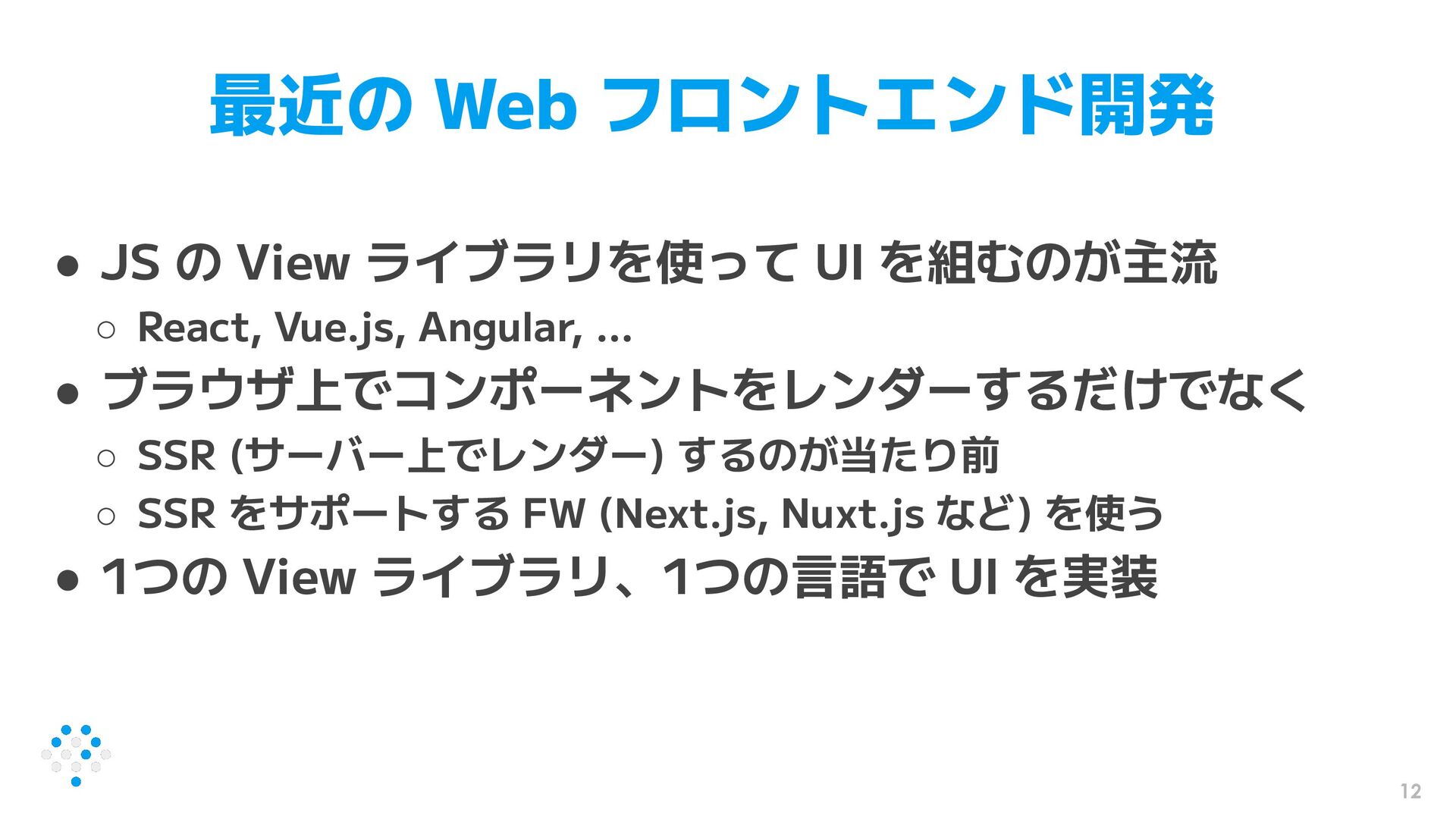 を組むのが主流 ◦ React, Vue.js, Angular, … • ブラウザ上でコンポーネントをレンダーするだけでなく ◦ SSR (サーバー上でレンダー) するのが当たり前 ◦ SSR をサポートする FW (Next.js, Nuxt.js など) を使う • 1つの View ライブラリ、1つの言語で UI を実装