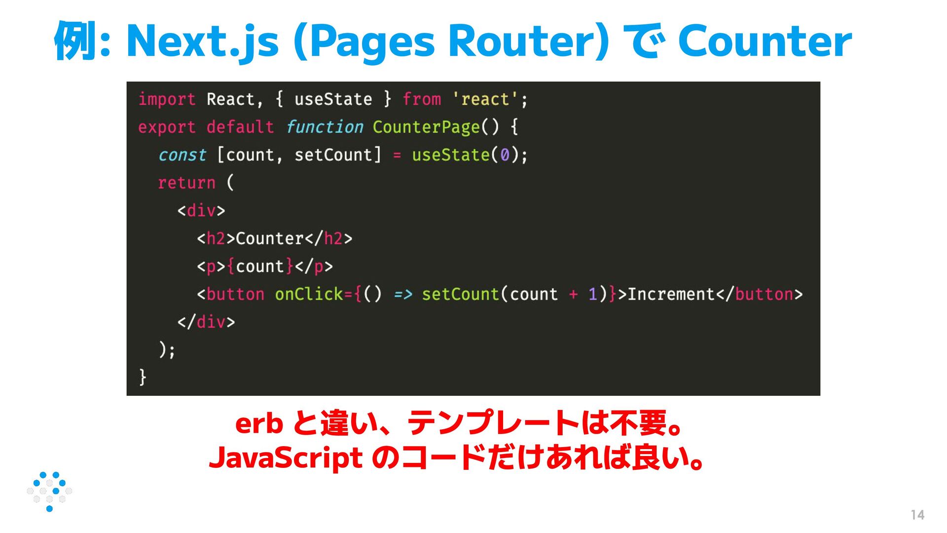 14 erb と違い、テンプレートは不要。 JavaScript のコードだけあれば良い。 例: Next.js (Pages Router) で